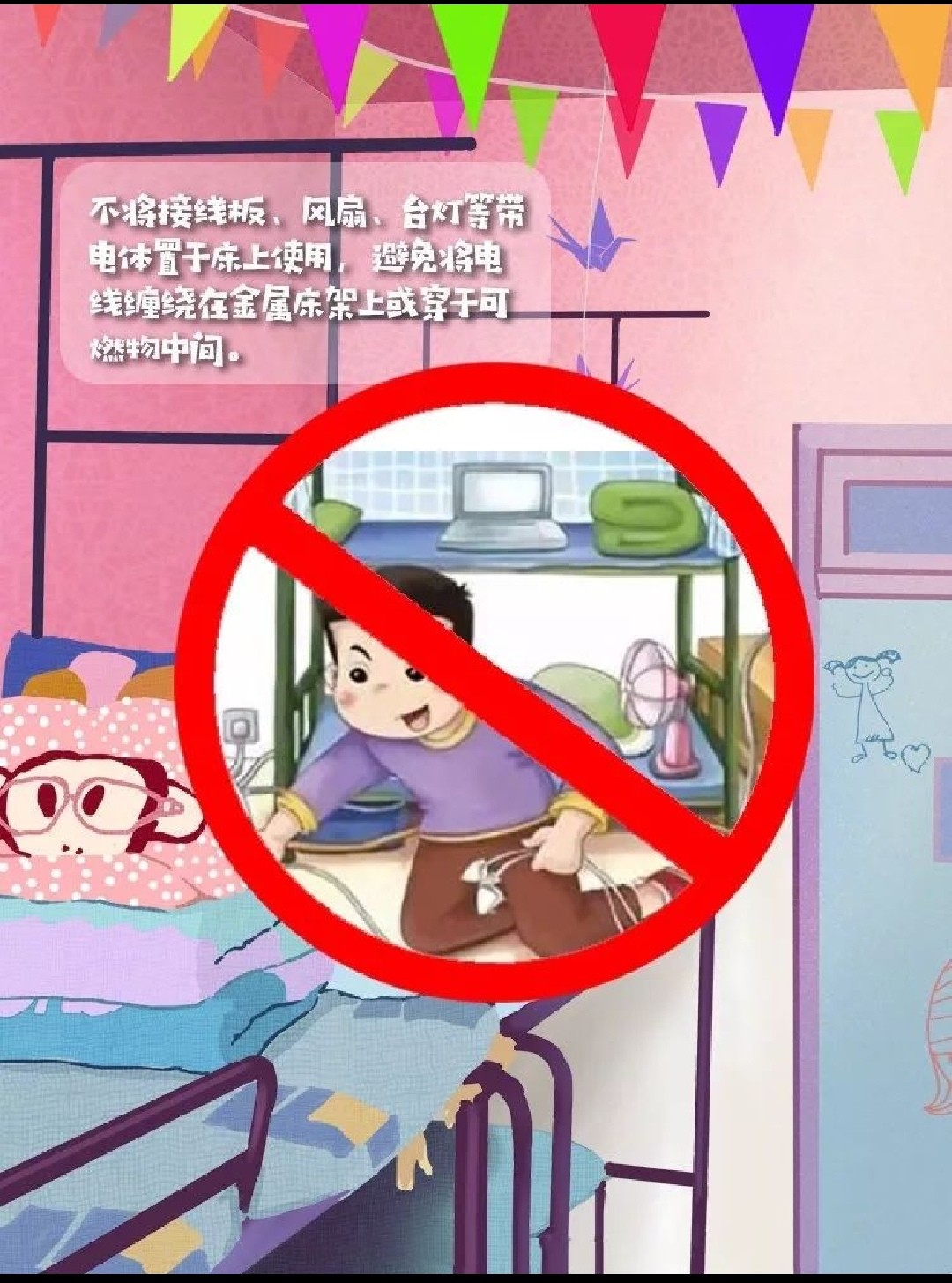 3不随意在宿舍内更改、折卸、安装电源线路、插座、插头等,也不要把铁钉等硬物凿入墙面,以防发生电线短路、触电等意外事故。