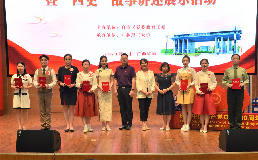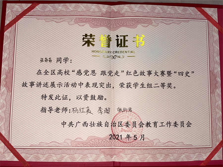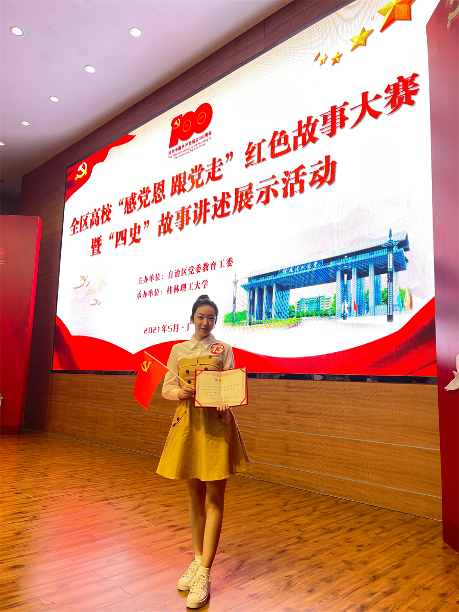 2021年5月30日,由自治区党委教育工委主办的全区高校“感党恩 跟党走”红色故事大赛暨“四史”故事讲述展示活动决赛在桂林理工大学屏风校区图书馆报告厅举行。我校动画学院播音与主持艺术专业2019张菲菲同学喜获学生组二等奖的优异成绩。