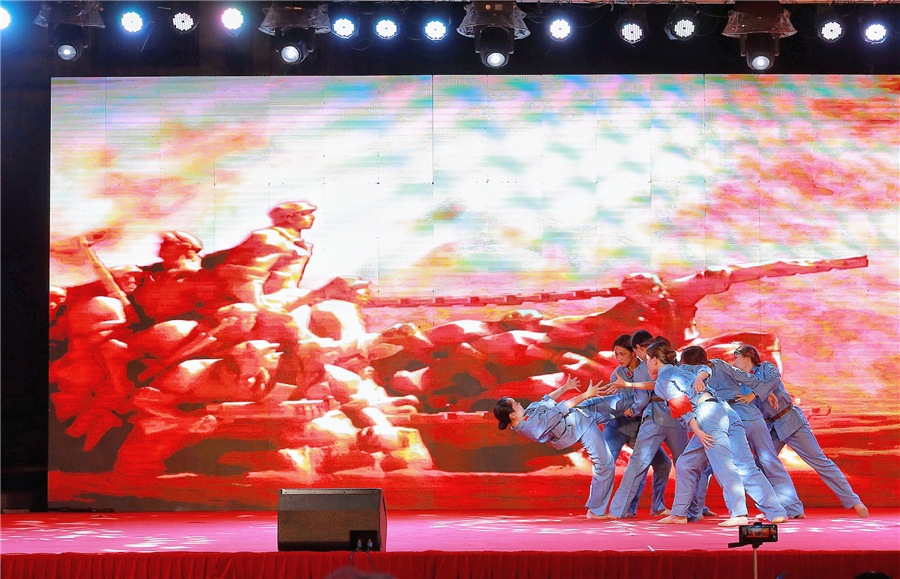 舞蹈表演1903班的学生带来《战地山花别样红》,带我们回到了过去的峥嵘岁月,感受到先辈们前赴后继牺牲的伟大精神。男生小组合唱《把一切献给党》,清朗的歌喉表达了中华儿女对党的深切热爱。 舞蹈《无名的功勋》,场面宏伟震撼,伴随着炮响轰隆的音效,让我们回忆起战乱和无名英雄崛起的年代,为这些无名的功勋致敬。 话剧社带来的《抗日英雄》,那些英勇无比的战士们,那些难以言喻的爱国情感,都深深地刻在了每个中华儿女的骨子里,令人动容。