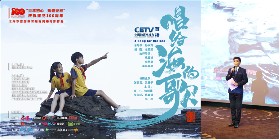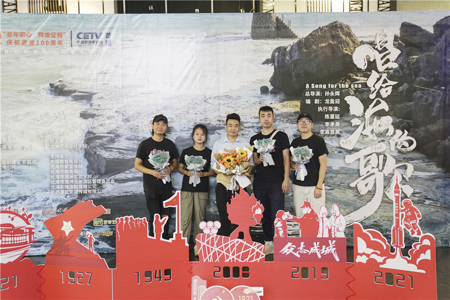 2021年6月30日下午,由北海艺术设计学院出品的建党100周年献礼片暨首部教育题材电影《唱给海的歌》首映仪式在北海万达影城举行。首映式由全国城市十佳金牌主播,北海广播电视台新闻主播李鎏主持,北海市委宣传部副部长、市新闻出版局局长陈言启,市教育局党组书记、副局长李祥吉,北海广播电视台台长、总编辑高峰,北海新绎游船有限公司党委书记杜启菊,北海旅游集团有限公司经营部负责人王啸,北海老城文化旅游投资有限公司副总经理韩宇廓,北海市电子信息行业协会副会长庞伟东,南宁师范大学梁谷子教授,桂林电子科技大学北海校区葛俊杰院长,学校党委书记张阳,校长卢新华等领导,及广西各高校专家学者、社会各行业代表、电影主创团队和北艺师生一同欣赏了这部诚意之作并为首映启幕。