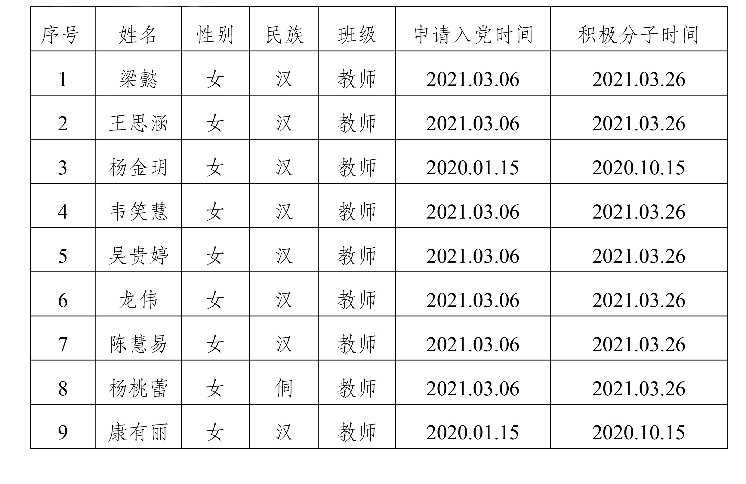 在征求党小组和党员、群众意见的基础上,经支部委员会审查,拟将梁懿等8位同志列为发展对象人选。根据发展党员工作有关要求,现将其有关情况公示如下,经党支部培养教育和考察,该同志已基本具备党员条件,在征求培养联系人、党员和群众意见的基础上,经中共北海艺术设计学院建筑与环境艺术学院教师第一支部委员会2022年10月11日讨论同意列为发展对象人选。
