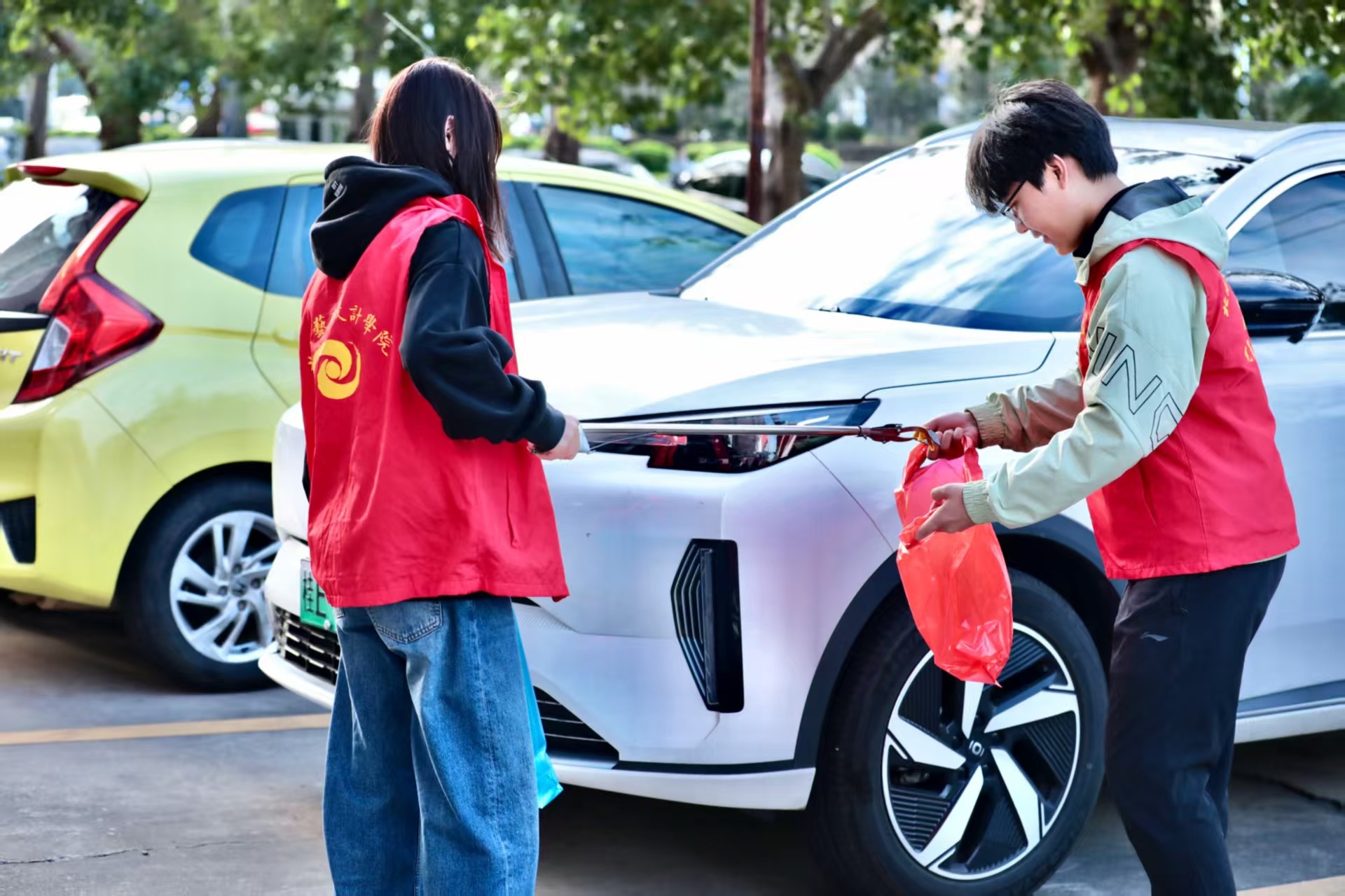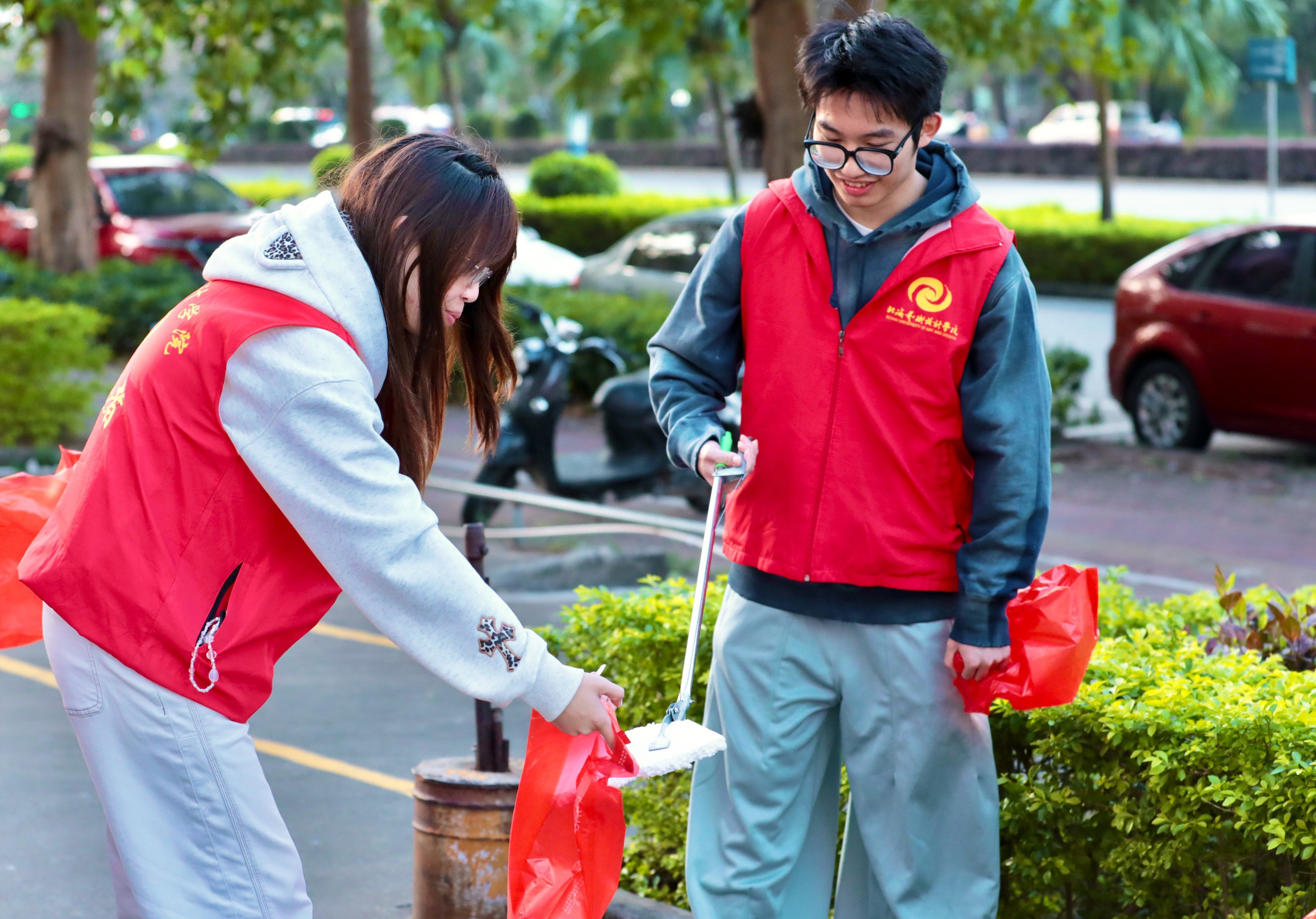 清洁现场,志愿者们身着统一志愿服装,手持清洁工具迅速投入工作。大家按照既定分工,对公寓道路、草坪、绿化带等公共区域进行全方位清扫。面对散落的塑料瓶、废纸屑等生活垃圾,志愿者们弯腰俯身逐一捡拾;清理顽固污渍,不放过任何一处细节。劳动过程中,同学们发扬“不怕脏、不怕累、不怕苦”的奉献精神,相互配合、彼此鼓劲,有的负责清扫收集,有的负责分类打包,有的负责转运垃圾,现场呈现出热火朝天的劳动景象。这劳动场景是最动人的亮丽景致。