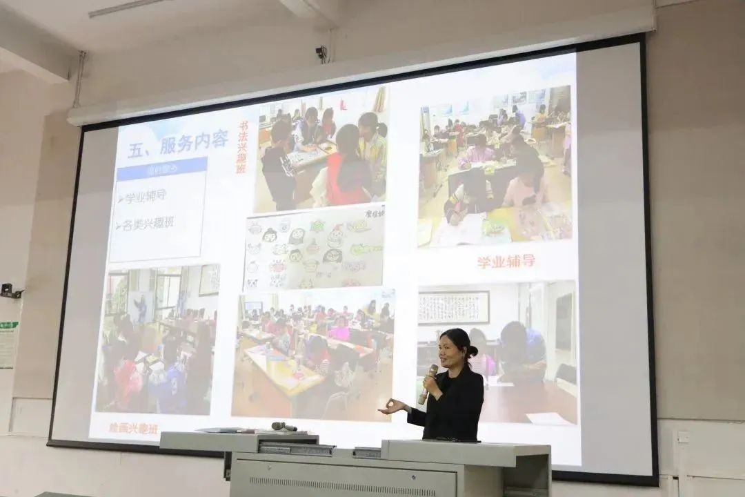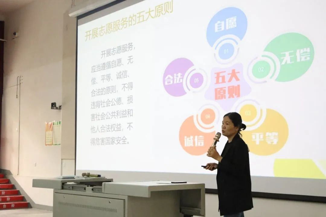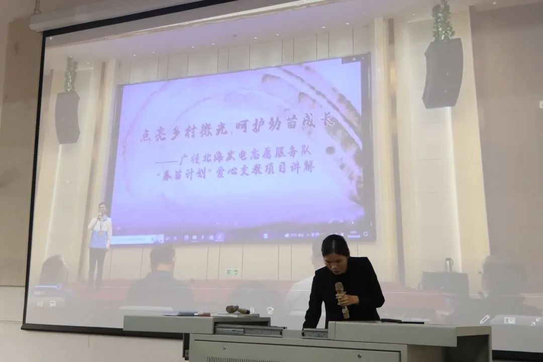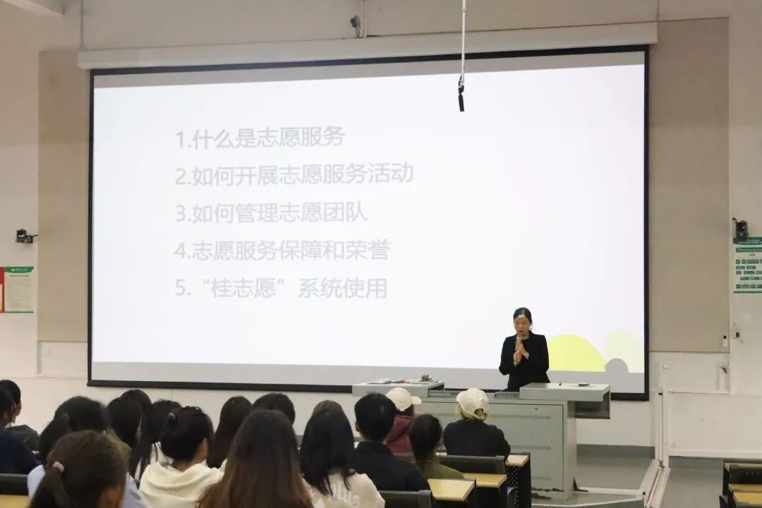 各学生完成签到并入座,志愿者培训正式开始。校团委青年志愿者协会各部门介绍其内容,随后由北海市青年志愿者协会负责人王柳妮给大家进行志愿者培训。负责人为志愿者讲解了志愿服务基础知识,“桂志愿”平台操作及相关注意事项。