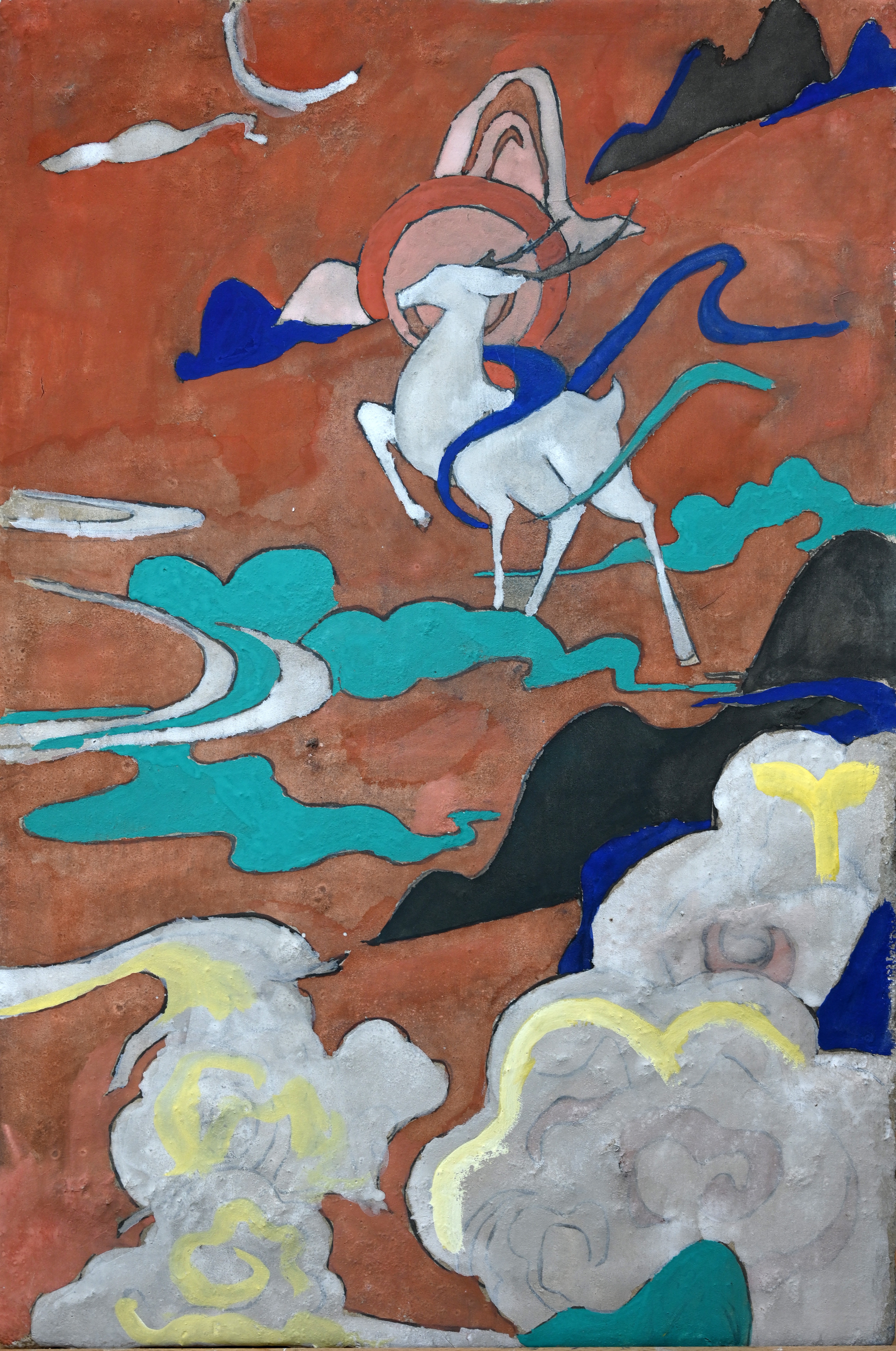 胡老师带着我们做地仗、模拟最真实的壁画体验,我们的作品也与原画同大,这都让我们更能深刻体会中国传统壁画绘画的语言表达。刚刚上手画的时候,我不太敢画,我们的画幅是最大的,但效果一直不强,导致我们小组出现明明应该是人多力量大却进度缓慢的问题。后来胡老师告诉我们254窟是北魏时期的,风格粗犷,可以大胆画…一直鼓励我们引导我们大胆的表现,最后我明白完成比完美更重要。在初次上色时,我采用水彩技法里的平涂法铺色与壁画原作有着较大差距,胡老师后来告诉我们中国画要以线造型,用线找型,通过练习,我也逐渐感受到了中国画画法的独特魅力。