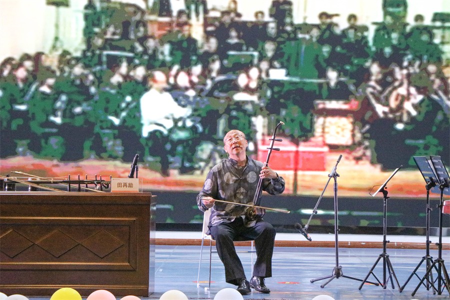 在下半场的二胡专场音乐会中,田再励教授为师生们现场演奏了经典名曲《二泉映月》《江河水》《江南春色》《一枝花》《葡萄熟了》等风格迥异又家喻户晓的二胡名曲,观众沉浸在田教授的细腻质朴的音乐当中,掌声不时响起、久久不息。
