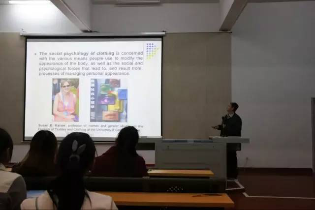 讲座中,郭教授通过中外服饰文化研究与外语应用的结合,叙述了外语与服装设计的重要性,并将他自身的经历转换成经验故事与现场的观众一同分享交流,为学习服装设计的同学指出了一个新的学习方向。接着,郭教授还介绍了服饰文化在日常生活中的重要性,不同的服饰能够体现出不同文化之间的联系与差别,为同学们播放了几个典型的时装秀节目,更好的诠释了他的理念。