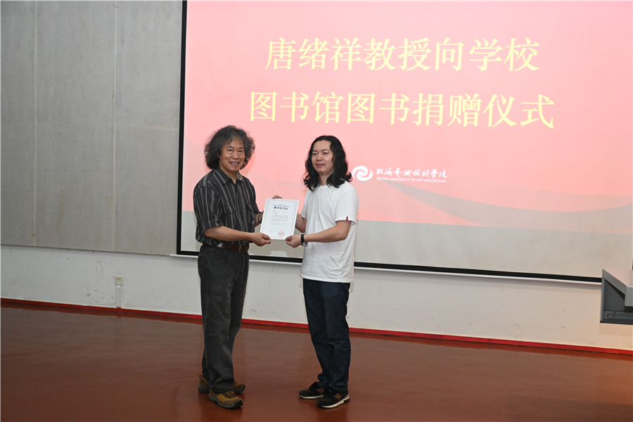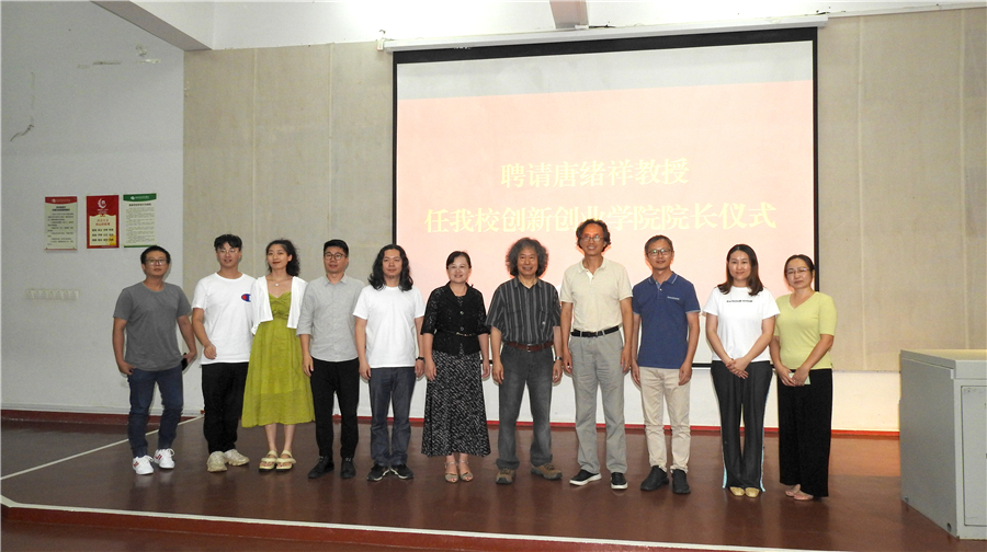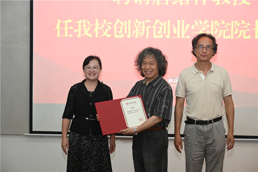 讲座正式开始前,学校党委书记张阳、校长卢新华为唐续祥教授颁发聘书,聘请他为我校创新创业学院院长。唐绪祥教授为我校图书馆捐赠图书,由我校副校长胡胜代表学校接收赠书。