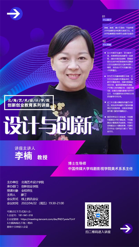 4月22日,中国传媒大学戏剧影视学院教授李楠应邀为我校开展题为“设计与创新”的线上讲座,讲座由我校设计艺术学院廖汀主任主持。