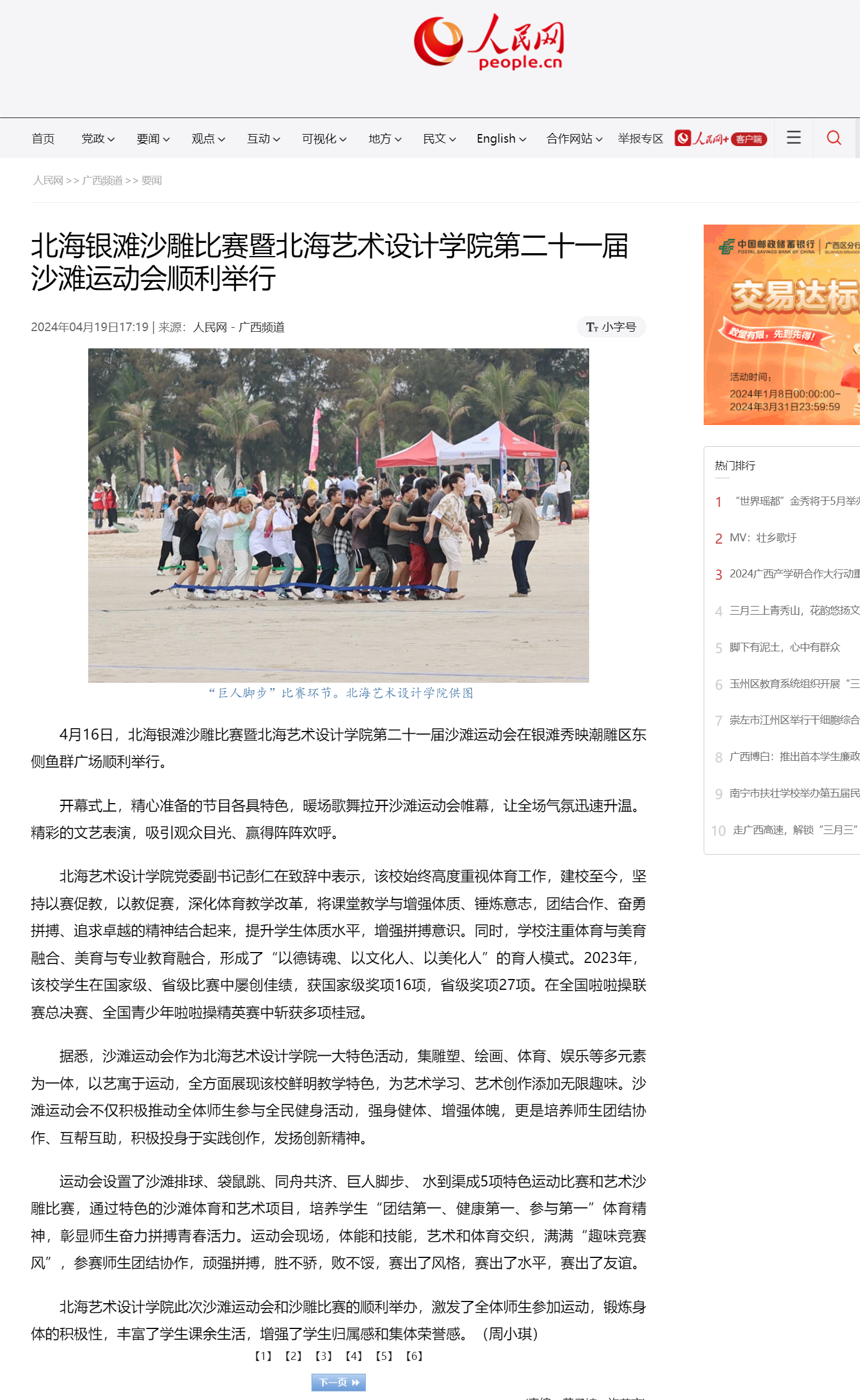人民网:北海银滩沙雕比赛暨北海艺术设计学院第二十一届沙滩运动会顺利举行