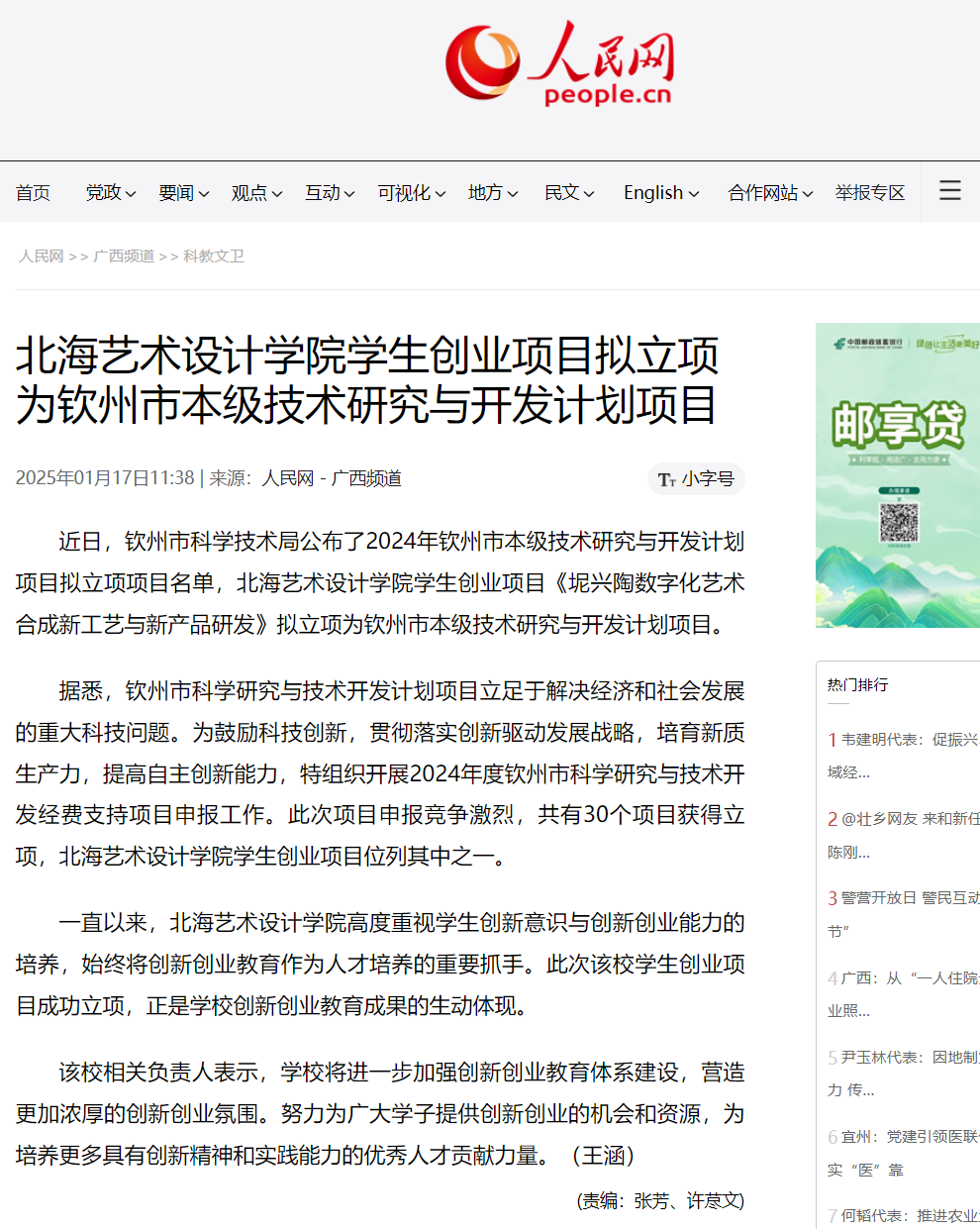 人民网:北海艺术设计学院学生创业项目拟立项为钦州市本级技术研究与开发计划项目