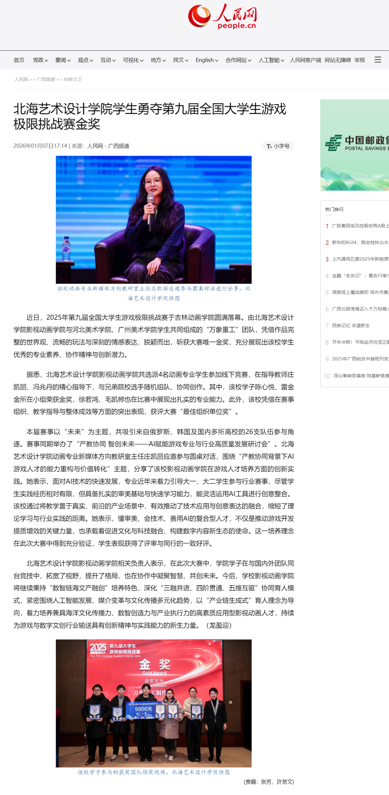 人民网:北海艺术设计学院学生勇夺第九届全国大学生游戏极限挑战赛金奖