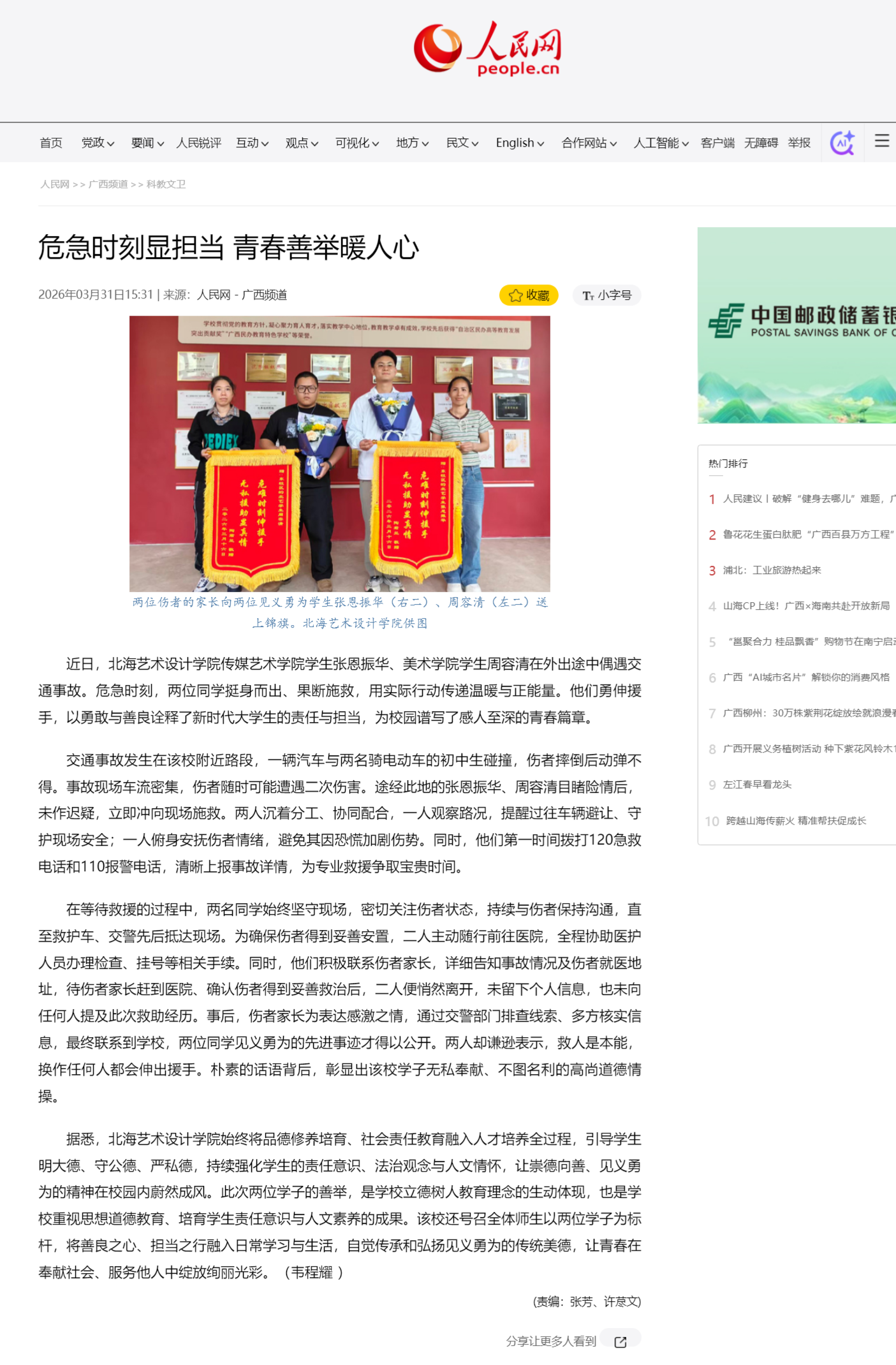 人民网:北海艺术设计学院校团委申报2026年广西共青团“伙伴计划”公益项目成功立项