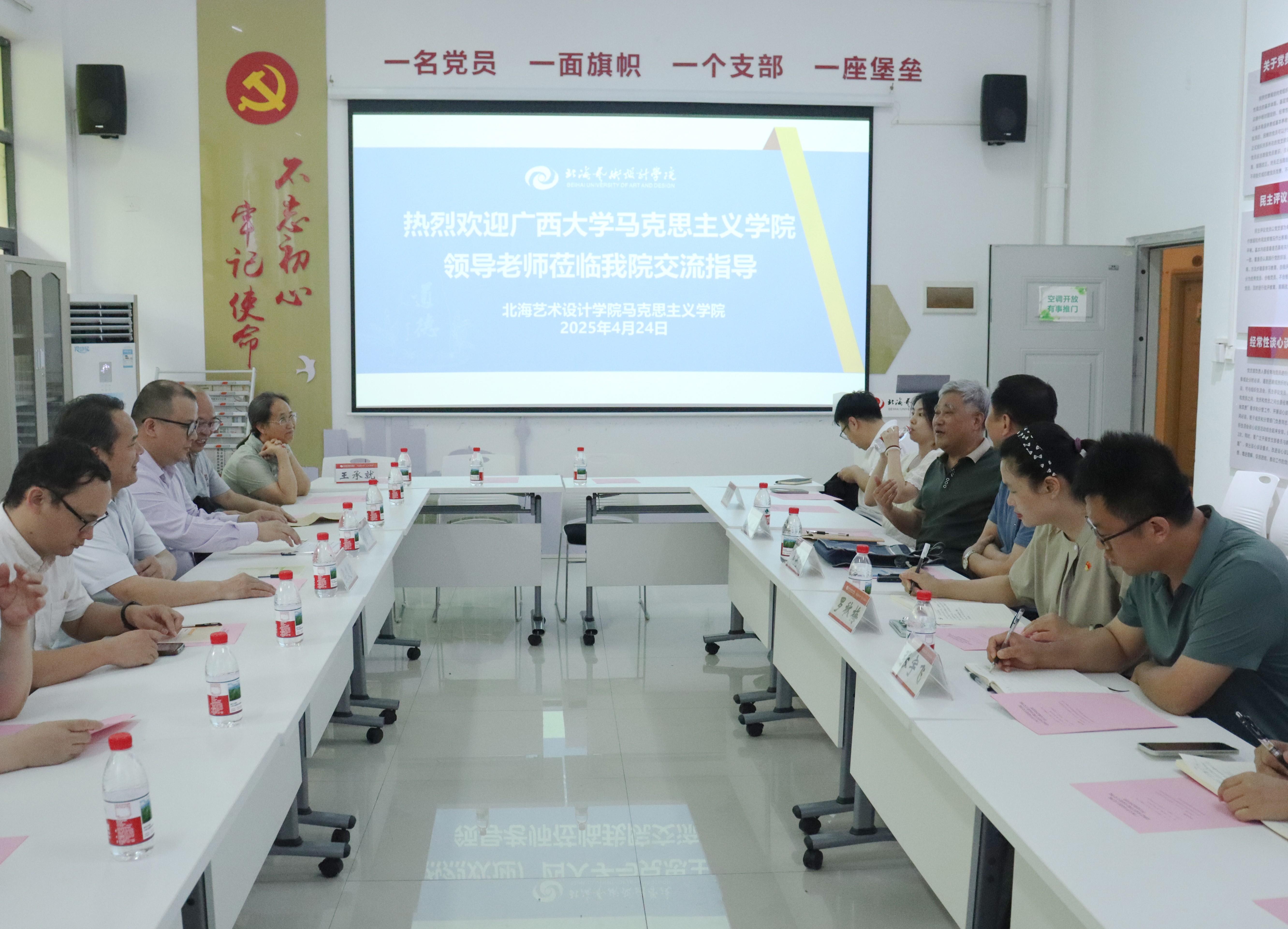 4月24日下午15:00,广西大学马克思主义学院领导老师莅临我院交流指导,活动在学校西校区行政楼103举行,学校党委书记覃宪儒,我院院长姜献生,我院党支部书记、副院长罗秋梅、综合办主任王佳碧、毛泽东思想和中国特色社会主义理论体系概论教研室主任张宇飞、党支部支委成员、兼职组织员以及其他专任教师参加了此次交流活动。我院院长姜献生主持交流活动。