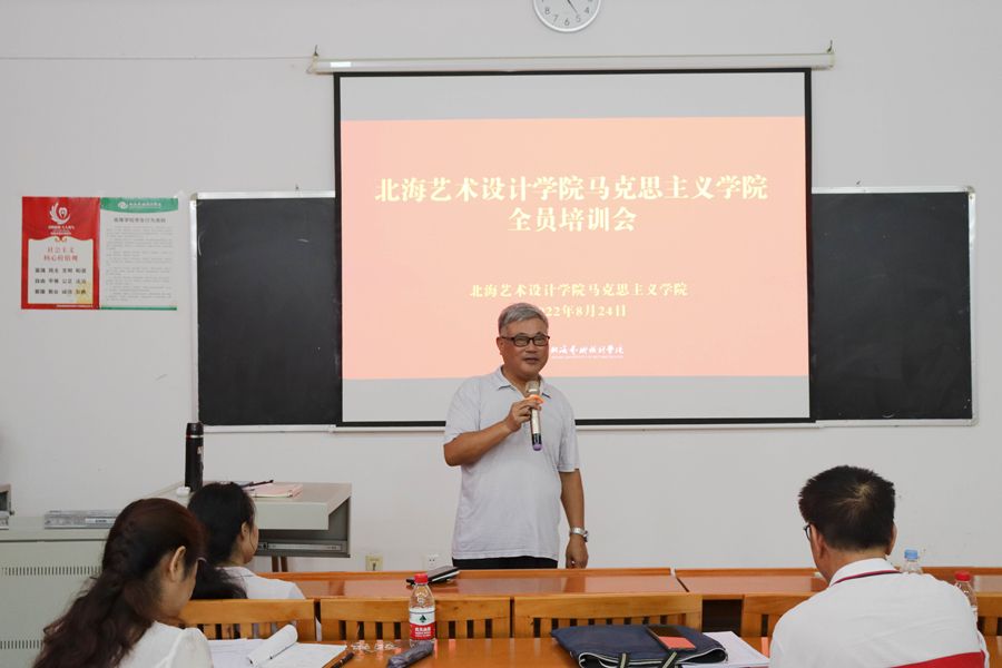 开学伊始与全员培训“齐共振”。8月24日下午,在学校西校区伦理楼102,我院在开学工作会之后,紧接着召开了开学第一场全员培训会,院长姜献生以马克思主义学院建设、思想政治理论课教学模式、思政课教师定位与要求为主题对全员进行了培训。在培训中,他要求,我院要不断完善“五型”教学单位建设、继续打造“四栖五大六动”教师队伍、创新突出“四位一体八化五结合”思政教学模式,发力打出马院品牌、思政品牌。全员培训会由我院副院长罗秋梅主持。