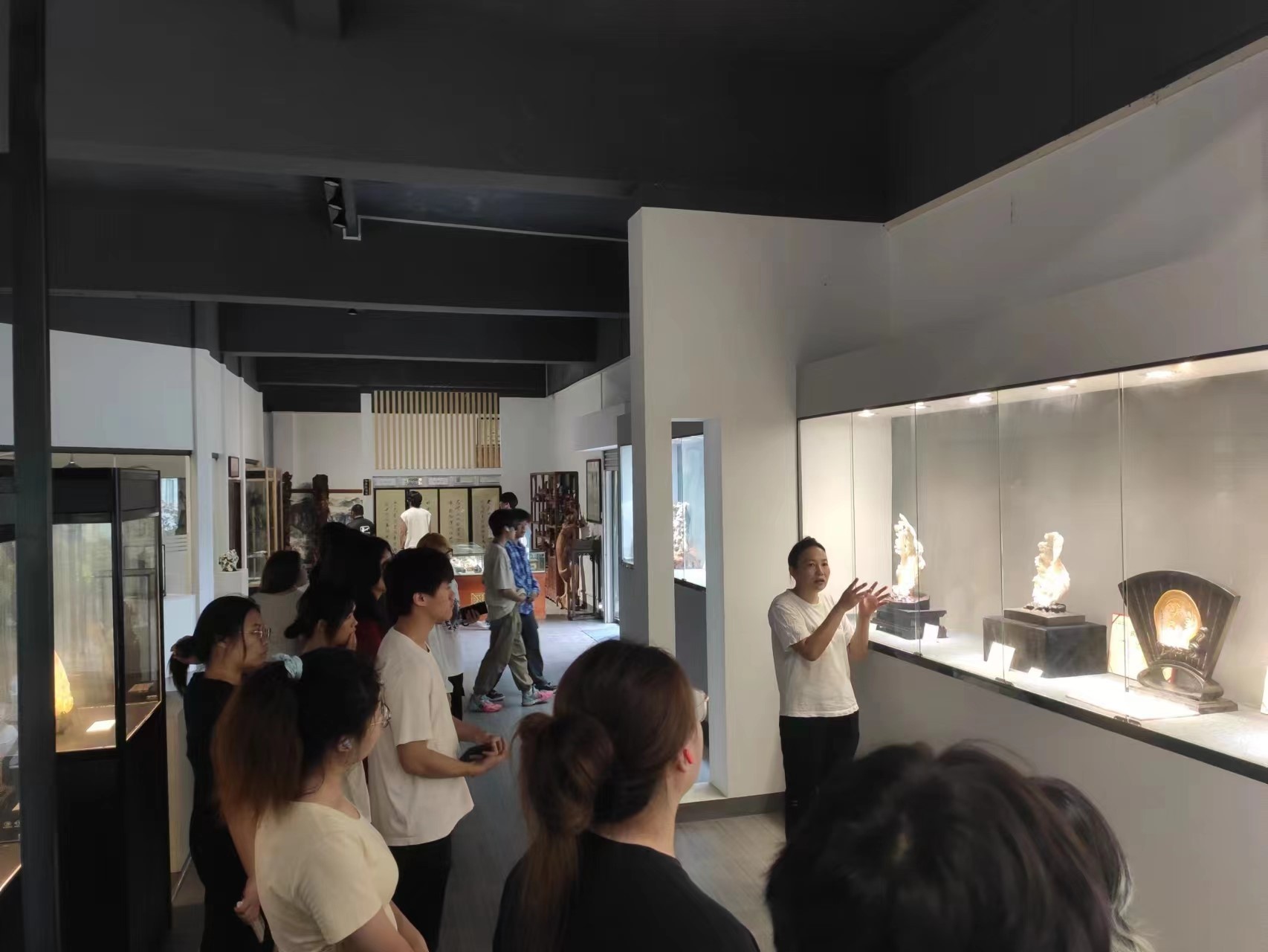 考察的第二站是龚琼辉玉雕博物馆,系统观摩广西特色玉雕南流江玉的工艺,深化传统雕刻技艺与当代艺术融合的认知,‌师生通过玉雕工艺流程的现场解析,学习南流江流域玉石材料的特性与雕刻技法。结合雕塑专业教学需求,重点探讨镂雕、透雕等传统技法在当代造型艺术中的转化路径,强化学生对材质语言的理解能力。