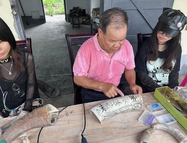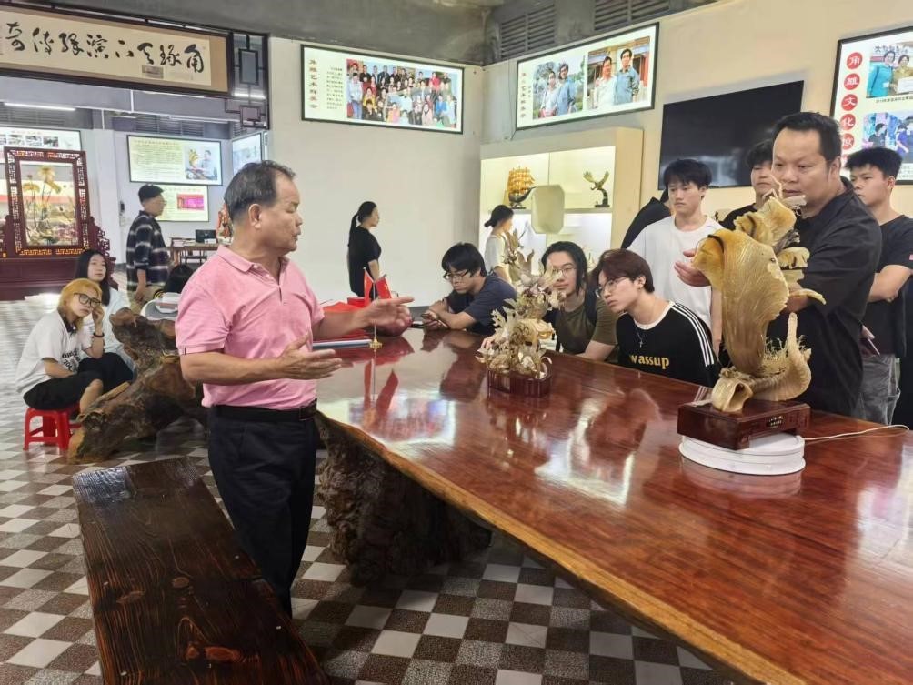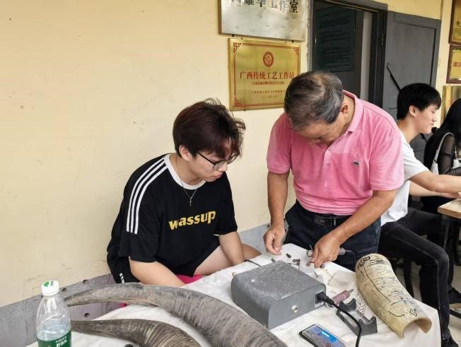 本次考查的内容着重在于‌传统工艺与专业融合,‌考察聚焦合浦角雕、南流江玉雕等广西特色工艺,结合雕塑专业特性,引导学生从材料运用、造型技法等角度分析传统工艺的现代转化可能性。活动中师生与非遗传承人白耀华大师交流、探讨传统雕刻技艺在当代艺术创作中的应用路径,以及角雕未来发展的趋势。