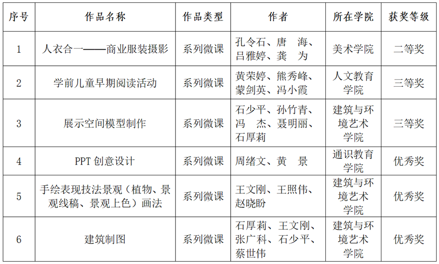 近日,自治区教育厅公布了第二十二届广西高校教育教学信息化大赛获奖名单(桂教教师〔2023〕73号),我校美术学院孔令石教师团队的作品《人衣合一——商业服装摄影》荣获系列微课组二等奖,人文教育学院黄荣婷教师团队作品《学前儿童早期阅读活动》、建筑与环境艺术学院石少平教师团队作品《展示空间模型制作》荣获系列微课组三等奖,《PPT创意设计》等三件作品荣获优秀奖。