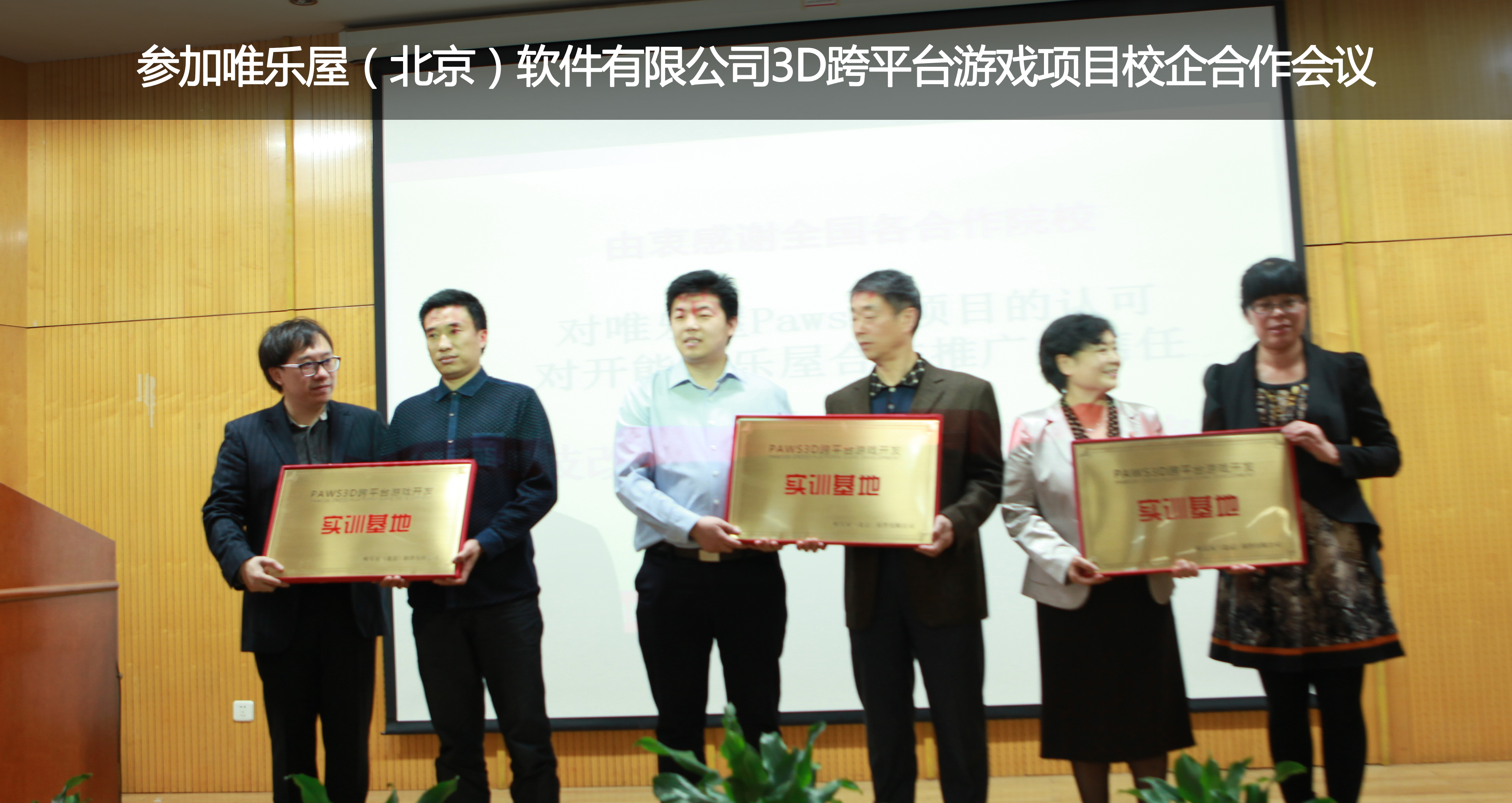 2015年4月23日,动画学院常务副院长陶立阳、实训实验室主任孙永辉老师受邀参加北京理工大学与唯乐屋(北京)软件有限公司主办PAWS3D3D跨平台游戏研发实训基地授牌暨沙盒发布会。并成功签署了“PAWS3D跨平台游戏项目校企战略合作协议”,同时获得了相应的实训基地运营授权,初步确定了双方合作建立PAWS3D跨平台游戏研发实训基地(PAWS3D跨平台游戏产品开发中心、PAWS3D跨平台游戏技能实训中心和PAWS3D跨平台游戏引擎核心技术实验室。Paws3D跨平台游戏开发沙盒作为国内首款,纯中文操作界面,商业化3D游戏开发工具,也是世界上第一个。