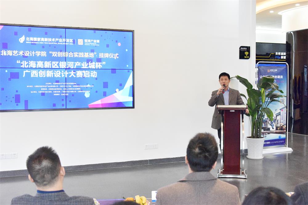 北海高新技术产业开发区管委会、北海艺术设计学院、北海人力资源与社会保障局、共青团北海市委员会的相关负责人,还有我院的师生们共同参加了北海艺术学院双创综合实践基地挂牌仪式暨“北海高新区银河产业城杯”广西创新设计大赛启动仪式。