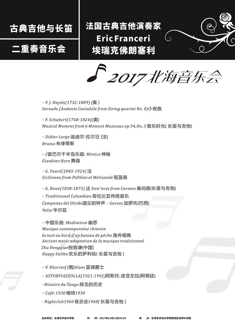 埃瑞克·佛朗塞利先生和郝雪雯女士给我们带来的不仅是一场音乐盛宴,还有我们对音乐的全新的认识,让我们了解音乐里有一个不一样的世界。难忘这一晚,感谢这一晚。吉他搭配着长笛,两位伟大的音乐家,委婉轻柔地向我们诉说着这来自法国古典音乐的文化与情怀。