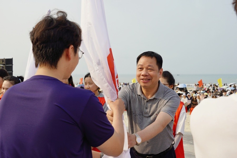 学校党委书记覃宪儒为沙雕代表队授旗