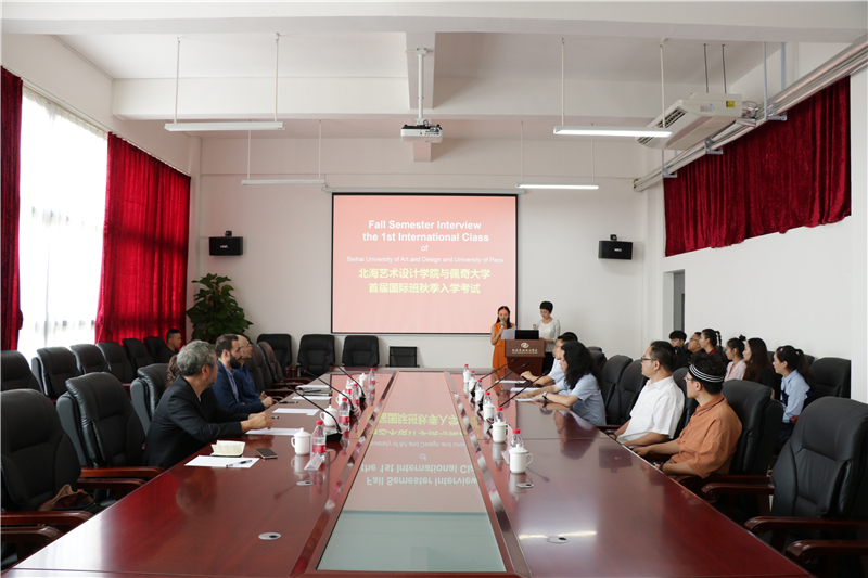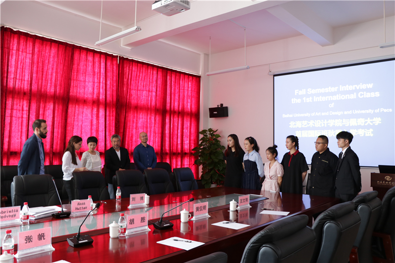 2019年5月23日上午8:30分于图书馆5楼会议室举行北海艺术设计学院与佩奇大学首届国际班秋季入学面试会。佩奇大学工程与信息学院院长Gabriella Medvegy、佩奇大学建筑学院博士生导师Akos Hutter、中央美术学院建筑设计研究院院长、博士生导师王铁教授、佩奇大学建筑学院金鑫博士、刘博博士,与我校副校长胡胜、建筑学院副院长张帆、环艺学院副院长王文刚、国际教育办公室主任黄侃明、国际教育办公室副主任王君辰等参加了本次国际班面试会。此次面试会由金鑫老师与刘钰老师主持。