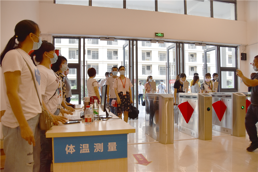 本次模拟演练按照预定流程开展返校进入校门、返回宿舍、教室上课、食堂取餐等四个环节演练。模拟学生返校后,消杀行李、扫码入校、测量体温、核验身份进入校园;返校经体温测量、扫码验证进入宿舍;上课时经体温测量进入教学楼;下课前往食堂排队测温取餐的四个场景。针对各个场景中出现发热学生实施应急处置进行了重点模拟演练,展示了体温复测、询问诊断、隔离处置、报告疫情、转移病人、现场消杀、心理安抚等系列处置过程。