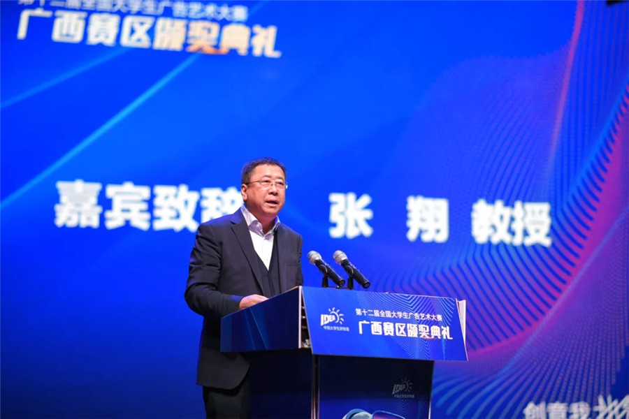 中国高等教育学会广告专业委员会常务理事、副秘书长、中国广告协会学术委员会委员、国家广告研究院副院长、中国传媒大学广告学院张翔教授出席典礼并致辞。他指出,大广赛作为含金量较高的一项国家级大学生赛事,已成为广西覆盖面广、影响力大、参赛院校数量、参赛学生人数多和作品最多的文科赛事,广西赛区在多年的积淀显示出了巨大力量。他希望,今后在新技术、新理念、新方法的加持下生成超越一般的教育教学成果,并将其创造性地转化为社会经济发展力量。