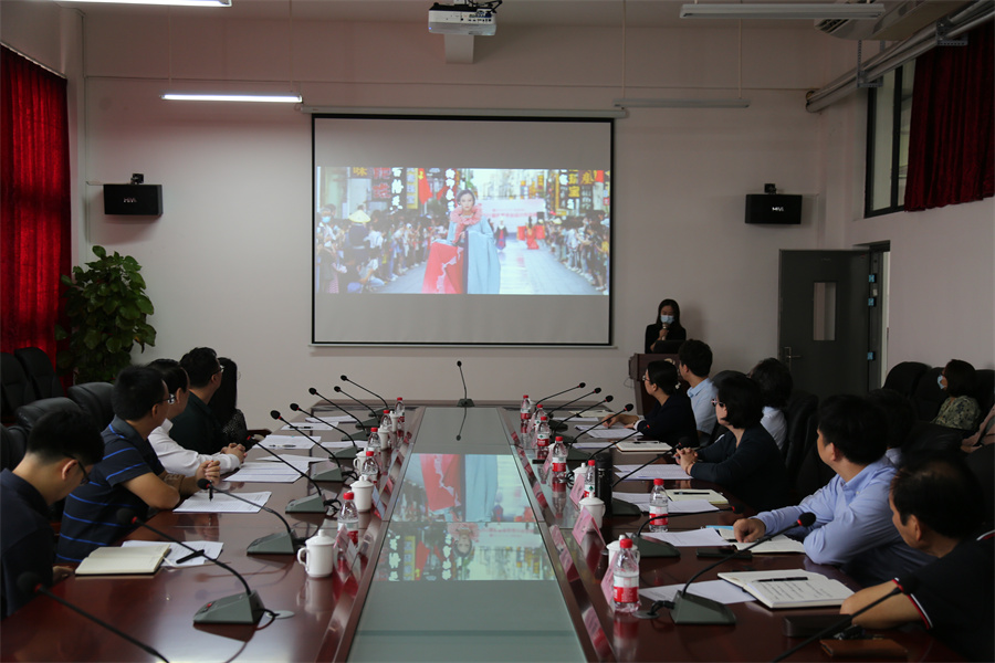 (唐安洲一行观看视频作品《半条被子》《唱给海的歌》《服装专业优秀作品走秀》)