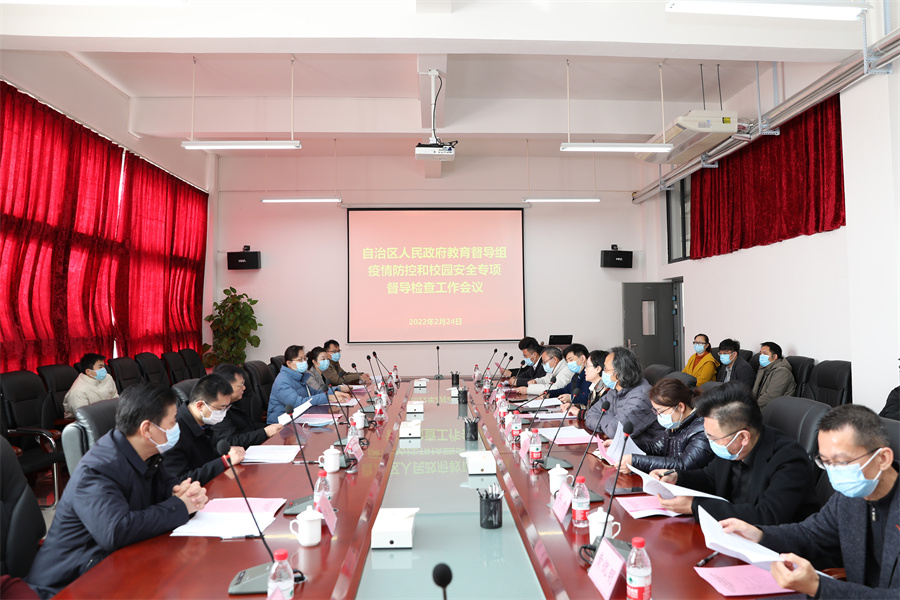 2月24日上午,自治区人民政府教育督导组长、教育厅二级巡视员汪维一行到我校开展疫情防控和校园安全工作专项督导检查。学校党委书记张阳,校长卢新华,董事长、副校长郑念贻等学校领导及疫情防控工作领导小组成员参加座谈会。