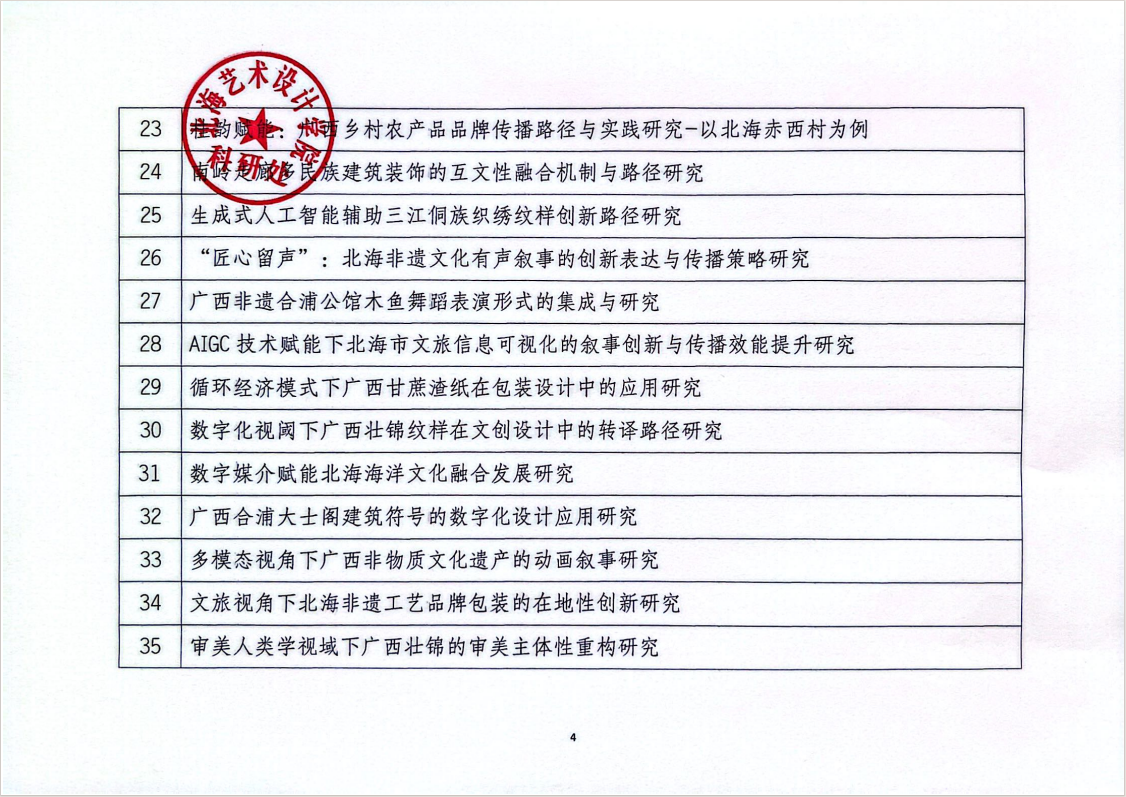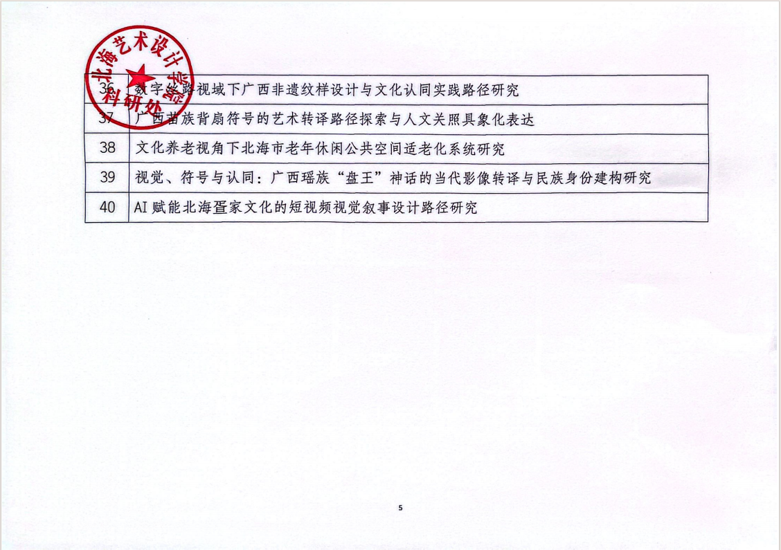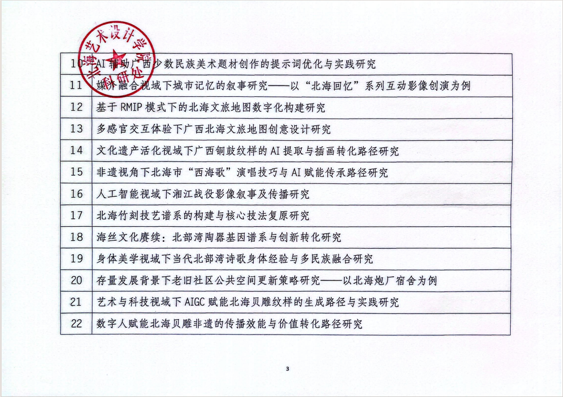 根据北艺科研〔2025〕30号《关于组织申报2026年度广西高校中青年教师科研基础能力提升培育项目的通知》的文件要求,我校积极组织申报。经个人申请、二级学院报送,由科研处负责项目筛查、人事部门负责申报人信息复核、校外专家函评、学校学术委员会专家评审与评议,现确定《数字赋能下北海博物馆资源视觉化转译设计研究》等40个项目通过本次项目评审,现将评审结果予以公示(详情见附件)。