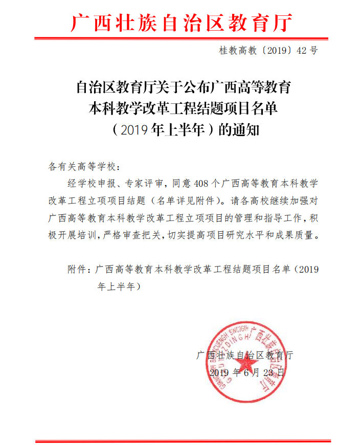 自治区教育厅关于公布2019年度 广西高等教育本科教学改革工程结题项目名单(2019年上半年)的通知
