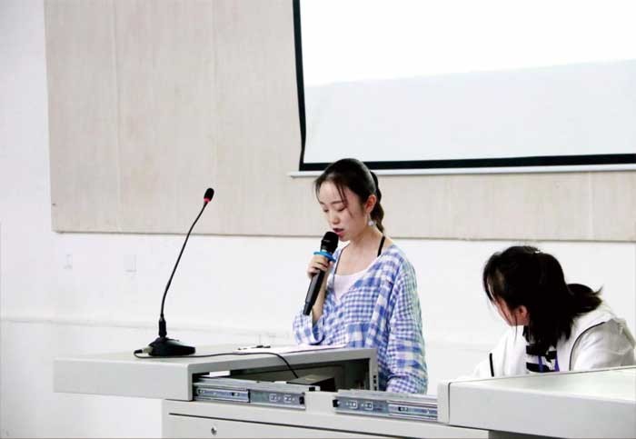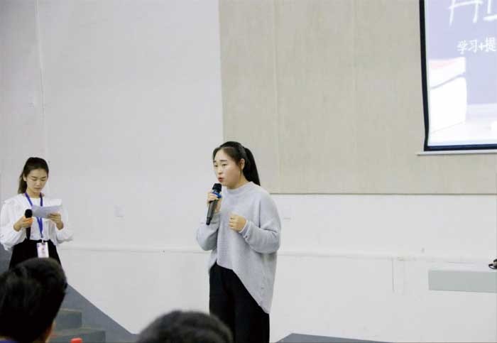 学习交流会开始,由服装与服饰设计系16级6班谭晶同学分享。她说进入大学,同学们应有良好的心态,一定要对自己有足够的信心,并在学习好本专业时也要注重英语的学习,与志同道合的朋友和家人保持联系。