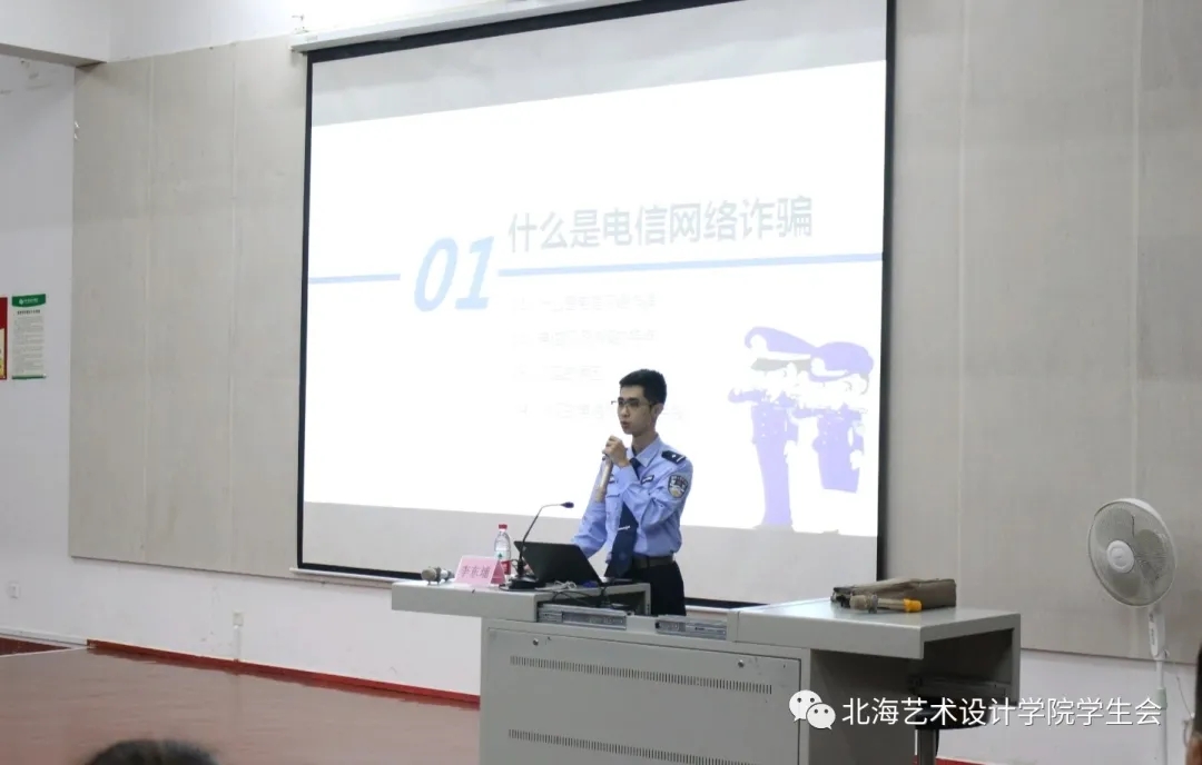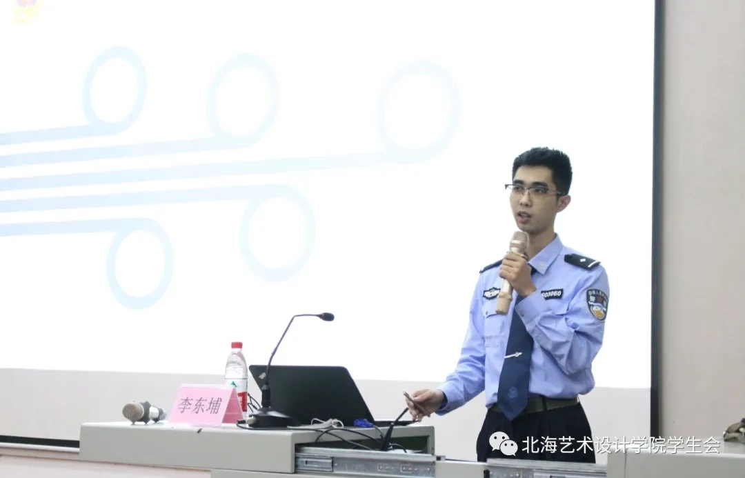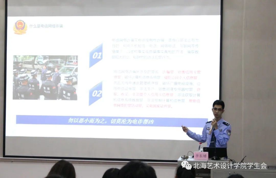 本次讲座由北海市公安局网络安全保卫支队副队长李东埔主讲,李警官不仅用真实的生活案件帮助我们分析常见的诈骗手法,还用海城公安自己拍摄的短视频给我们传授防骗知识,让我们更容易理解诈骗分子电信诈骗的手段。