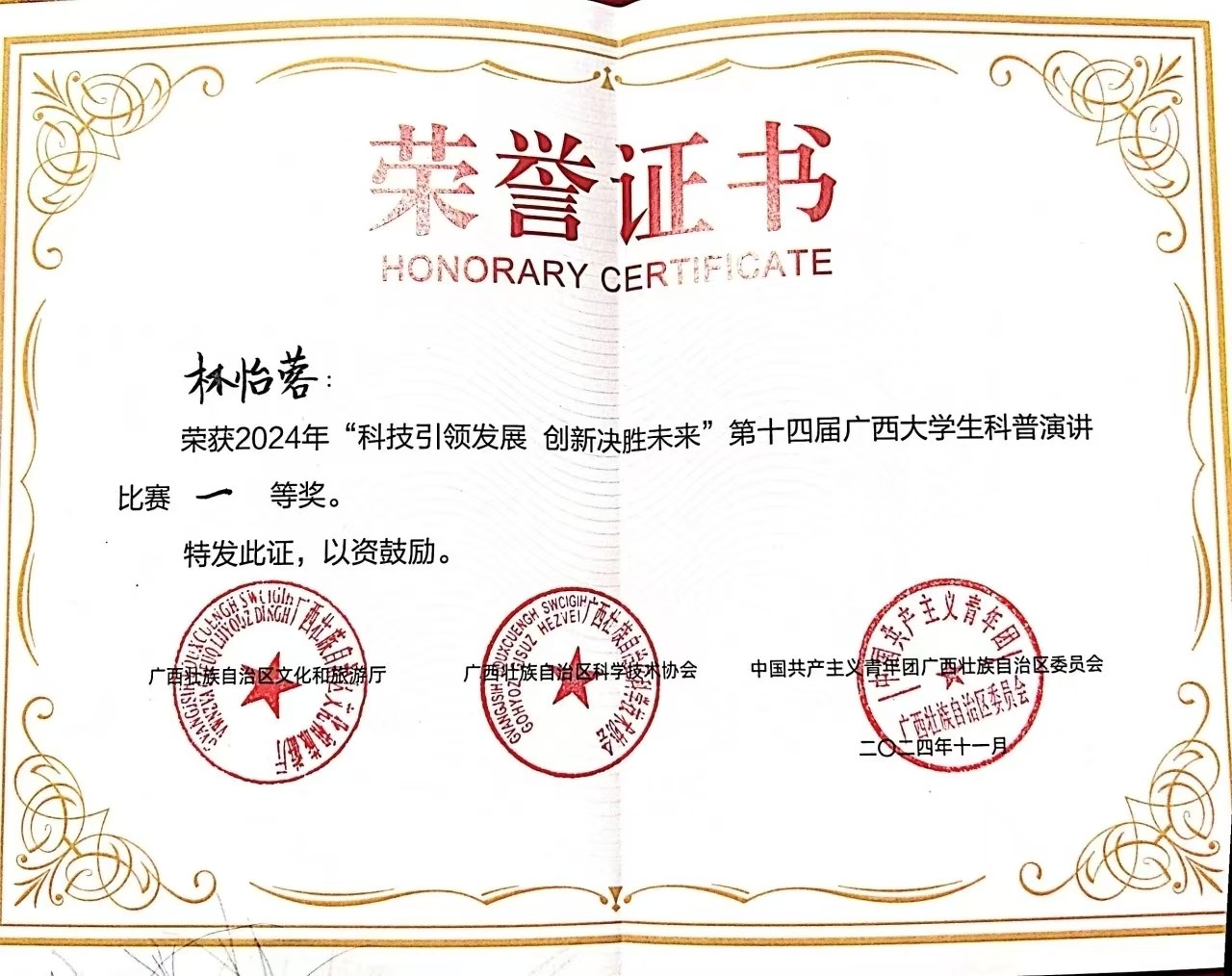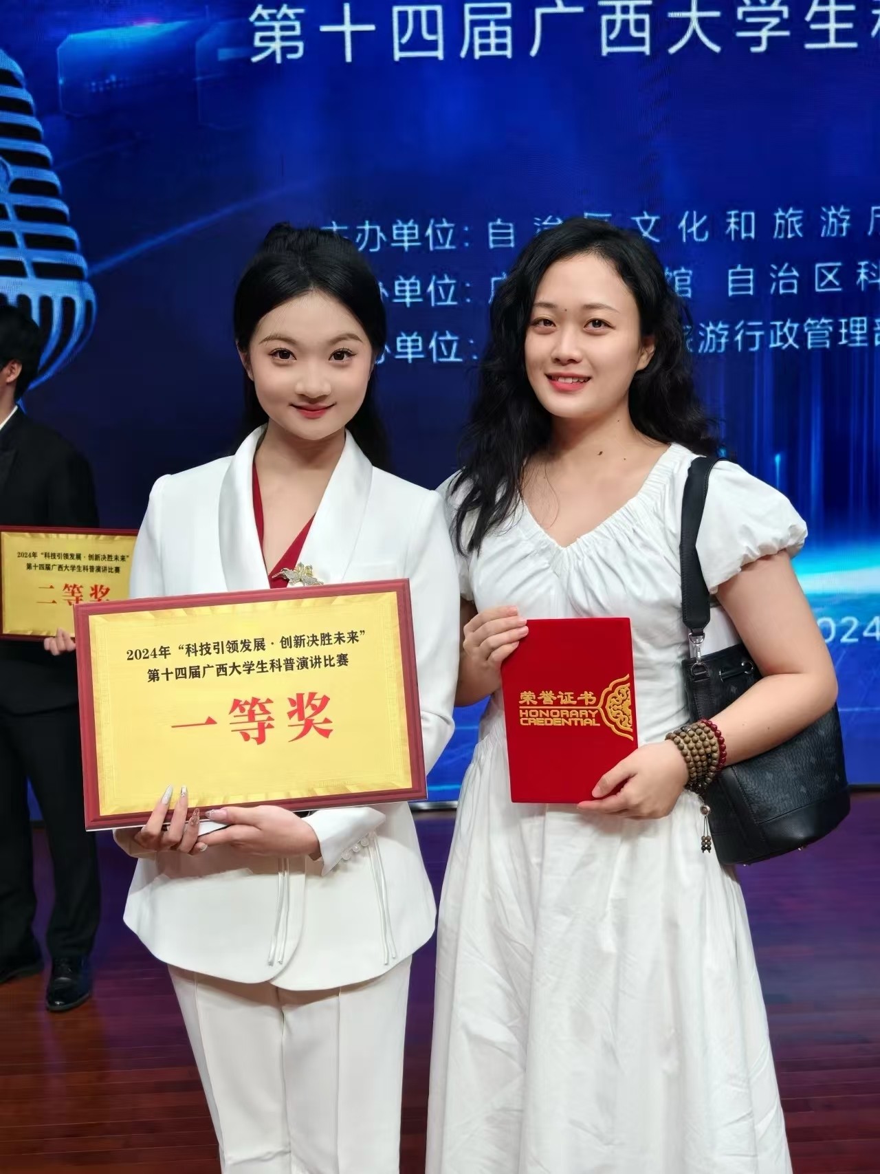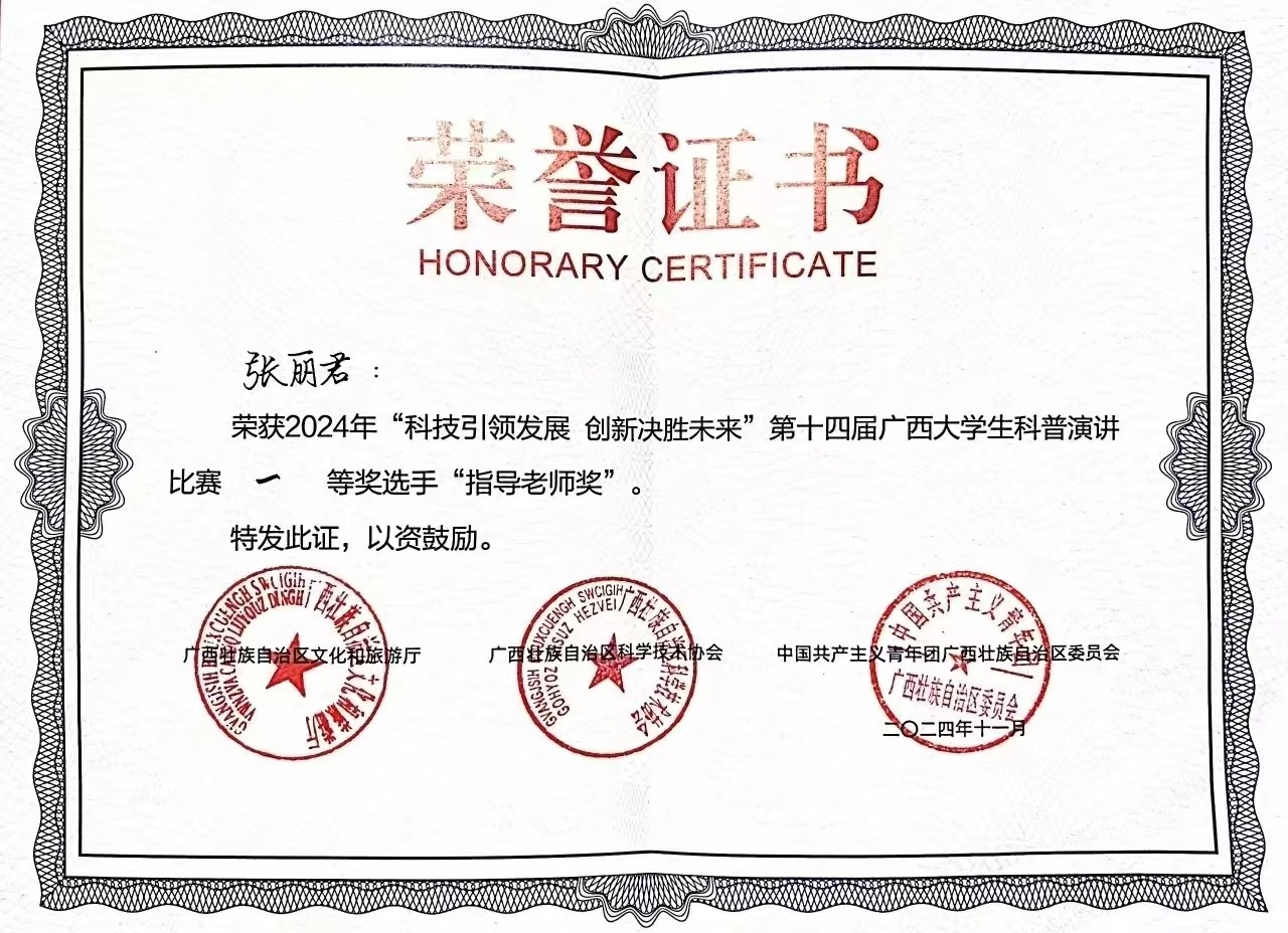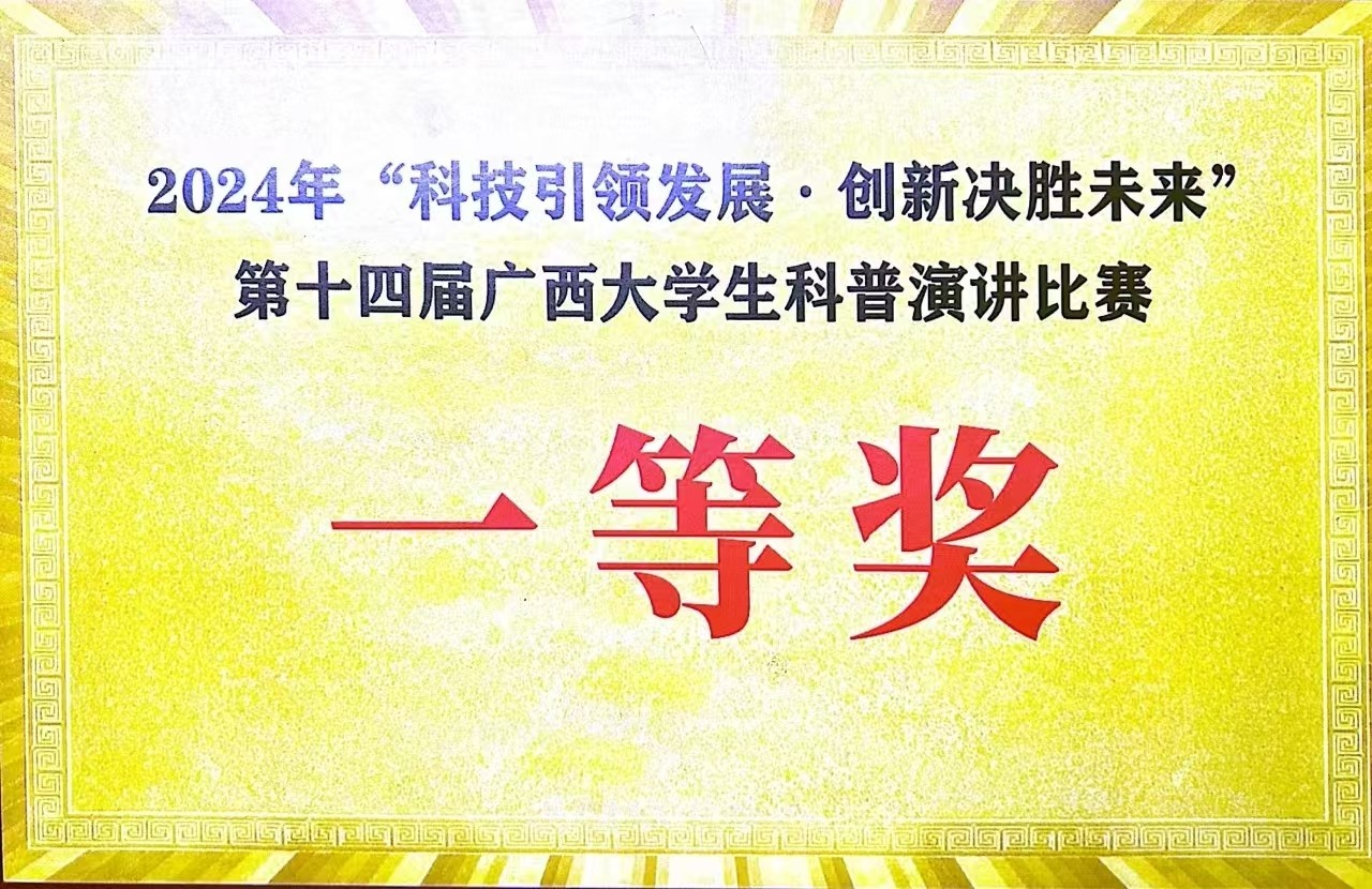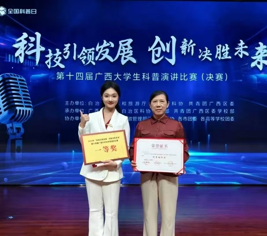 近日,第十四届广西大学生科普演讲比赛(决赛)在广西图书馆圆满落幕。我校师生在此次比赛中表现优异,其中我校教师张丽君荣获大赛指导老师奖,我校学子林怡蓉荣获决赛一等奖!