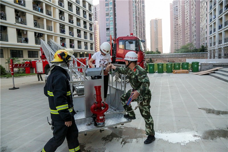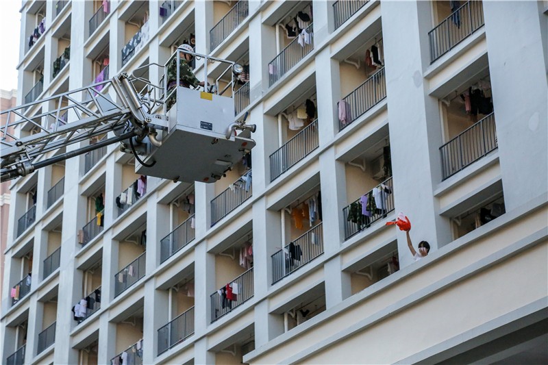 下午五点整,烈日当空,消防警报拉响,宿舍楼内冒出浓烈的白烟。保安人员立即赶往现场实施疏散和救援措施,学生们从宿舍楼内快速撤离,在老师和宿管员的指导下,同学们捂紧口鼻,以较规范的逃离姿势,有秩序的撤离火场。此时,救护人员及时赶到现场搜救被困人员。整个疏散过程,各部门紧密配合,所有人员在规定时间内撤离到安全救助点。
