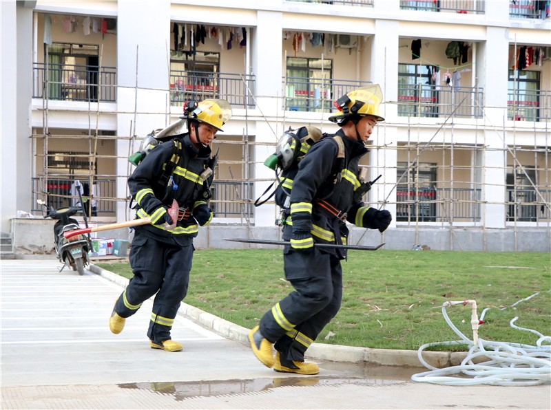 银海区消防大队电建渔港中队两辆消防车及时抵达现场,三楼1名学生被困,消防官兵携带担架、切割机等防护破拆装备营救,32米云梯消防车缓缓升起通道向火层靠近营救被困人员。消防大队员和我校保安队员利用水枪喷水以及灭火器灭火,火灾现场得到有效控制。