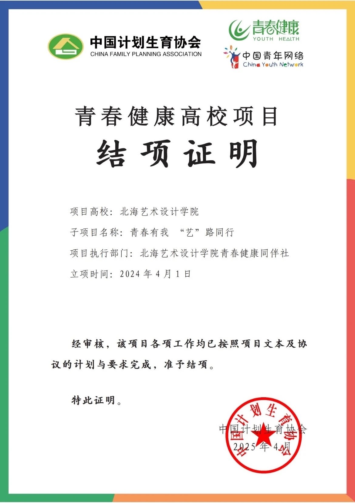 近日,中国计划生育协会印发《关于确定2025年—2026年青春健康“青铸未来”高校项目点的通知》,公布了2025年—2026年青春健康高校项目的评审结果,我校“共筑青春健康,‘艺’起走向未来”项目在全国600余份立项申请书中脱颖而出,获批立项并获得连续两年度的经费资助。