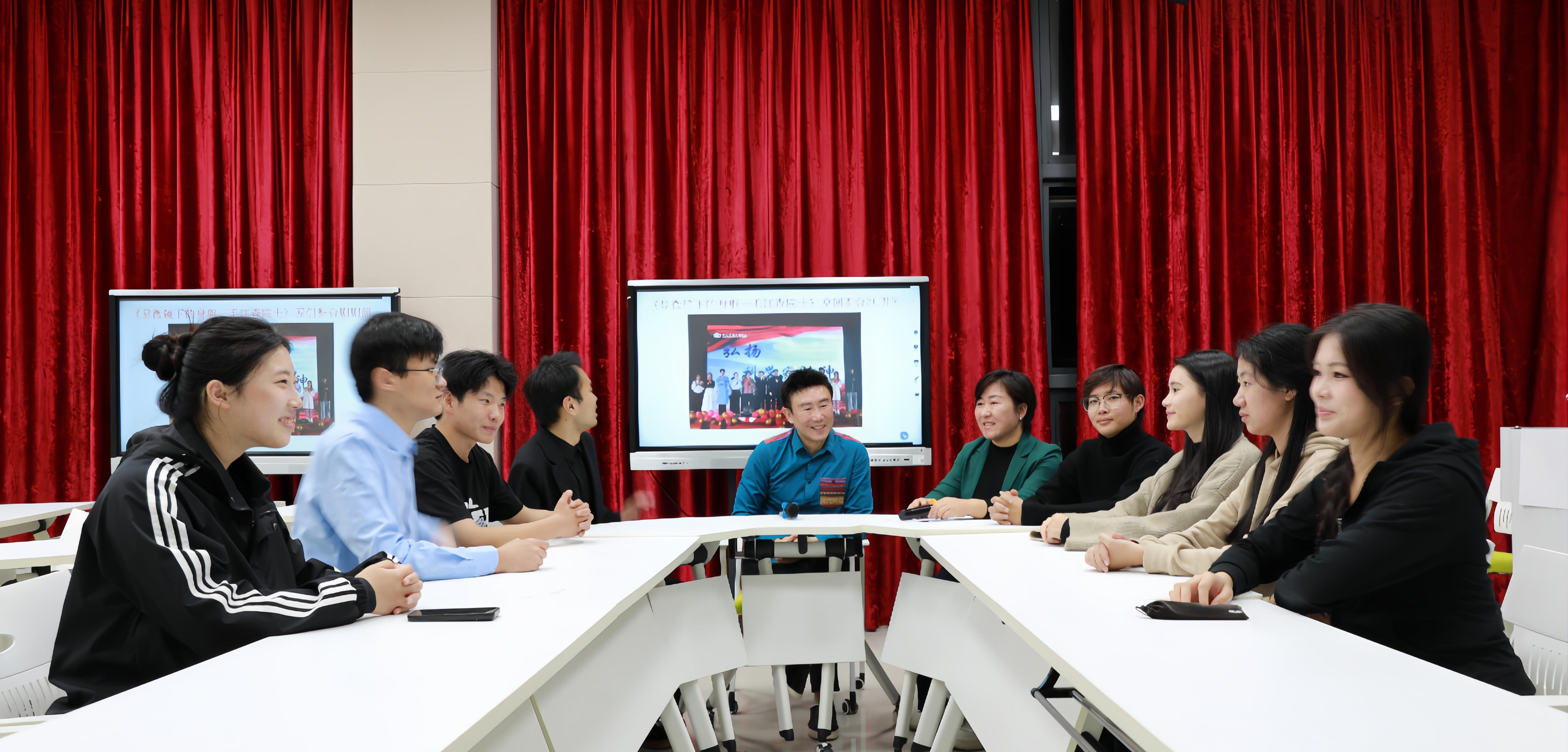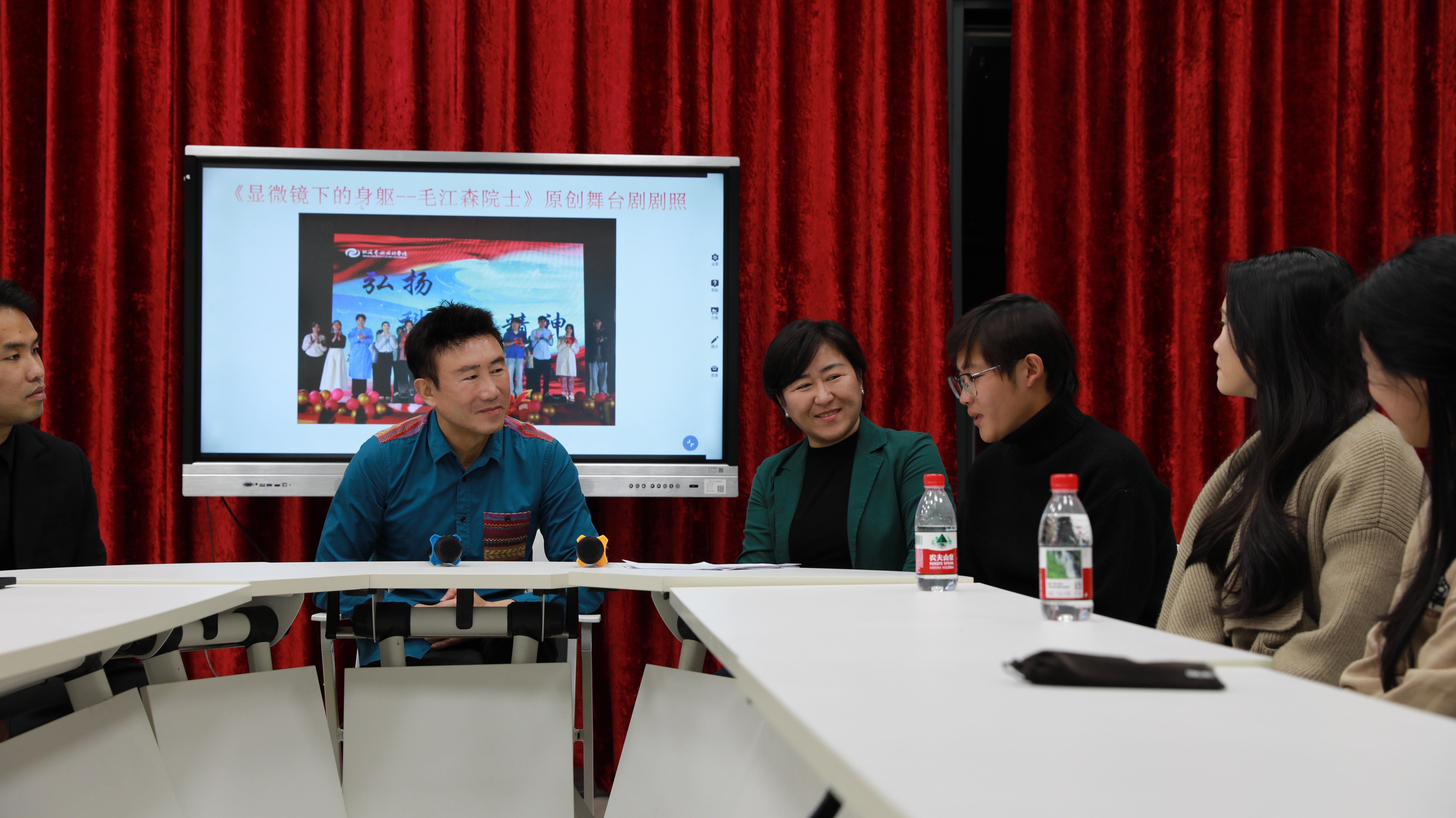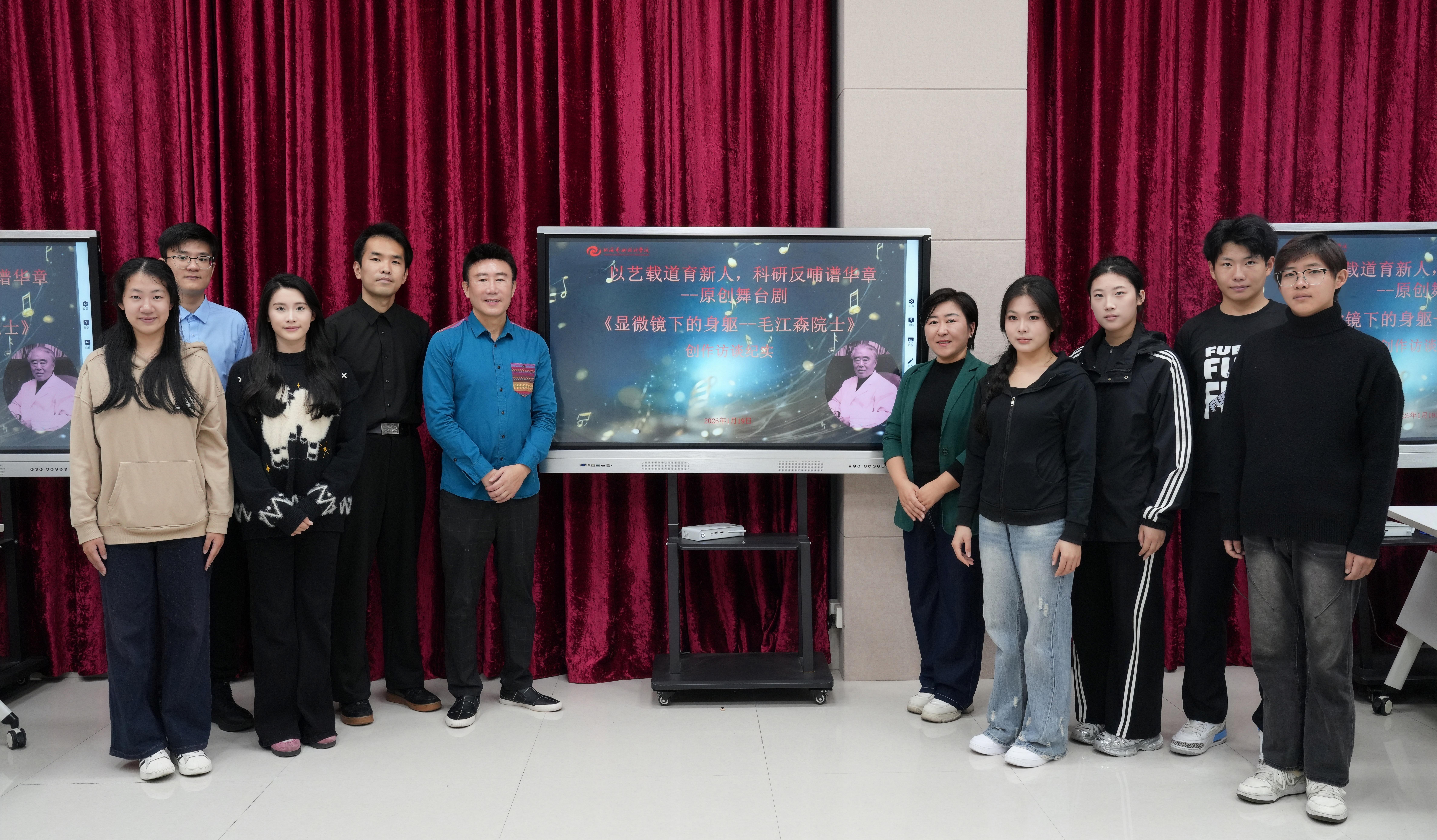 2026 年 1 月 19 日,我校科研处对原创舞台剧《显微镜下的身躯 —— 毛江森院士》主创团队专访活动在506智能教室举行。此次专访以 “以艺载道育新人,科研反哺谱华章” 为主题,邀请到项目总负责人、总策划、总编导、学校特聘教授王玥,科研处聂明丽副处长及学生主创代表齐聚一堂。专访由科研处马超老师主持,同主创团队以对话的方式分享创作背后的初心与坚守、实践中的成长与感悟。