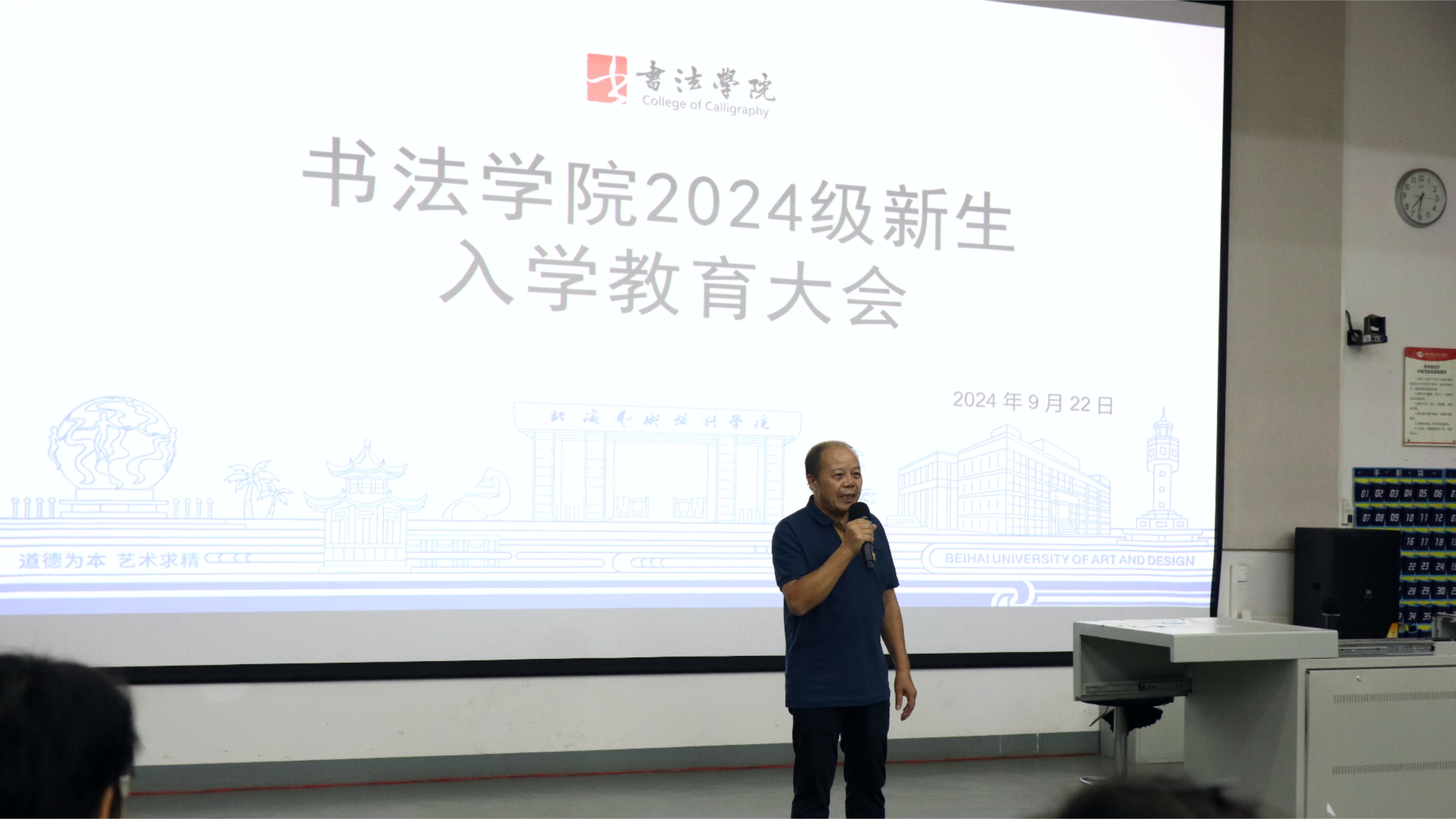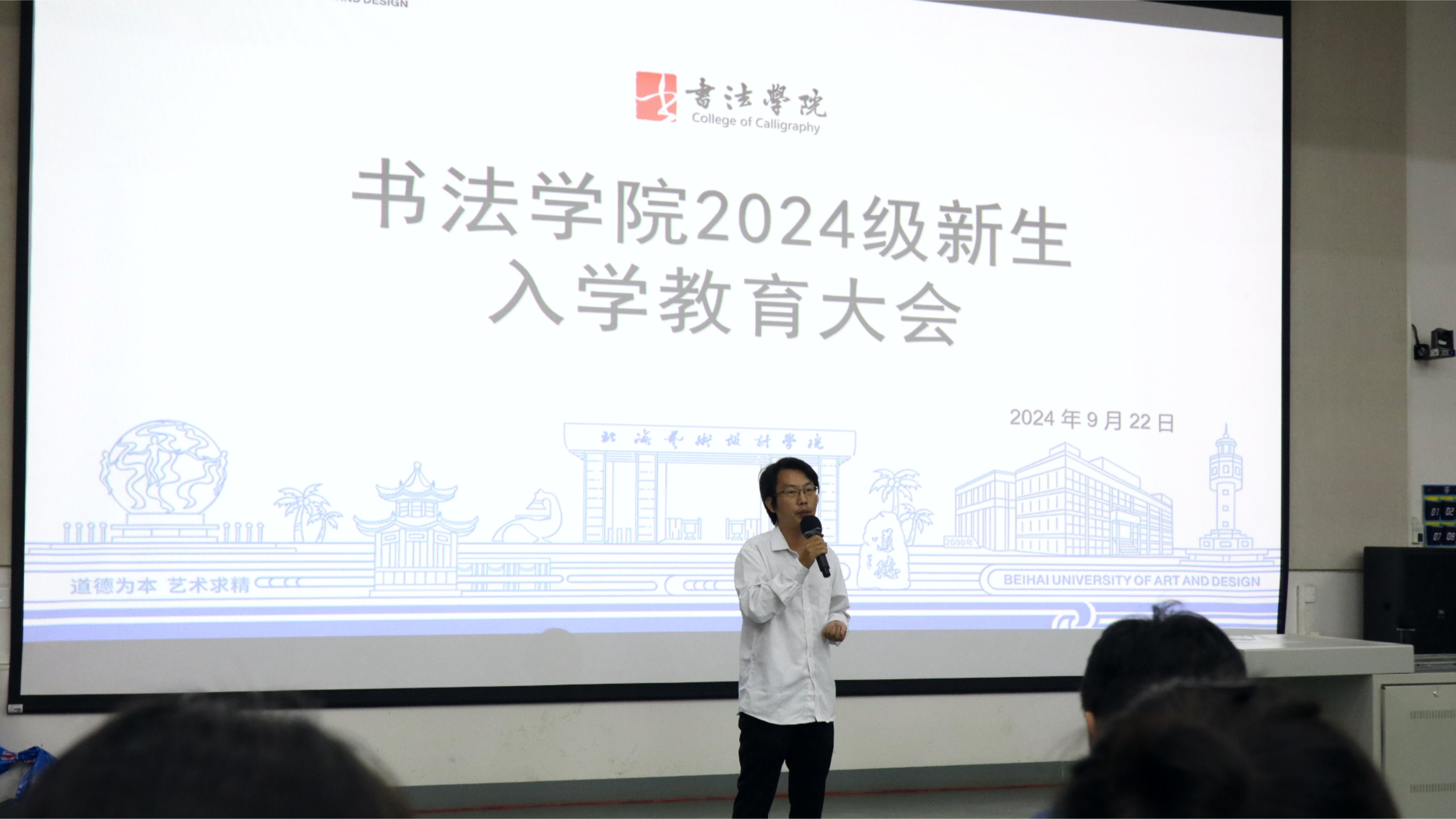 2024年9月22日晚7:30,书法学院举行2024级新生入学教育大会,书法学院院长黎东明、常务副院长苏乃从党支部书记喻广林出席大会。各行政职能部门领导老师、全体班主任以及2024级全体新生,共计近300人参加会议。会议由常务副院长苏乃从主持。