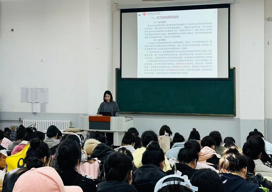 大会伊始严腾老师在发言中肯定了近年来学院在人才培养和就业工作方面的努力。她指出:实习是学生学习的重要组成部分,是实现理论与实践相结合的重要环节。她希望同学们能够充分认识到实习的重要性,珍惜这一宝贵的机会,积极投入到未来的实习岗位中,提升自己的专业技能和综合素质。当前就业形势日趋严峻,毕业生必须提前做好规划,积极参与实习,提升自身综合素质,才能在激烈的竞争中脱颖而出。