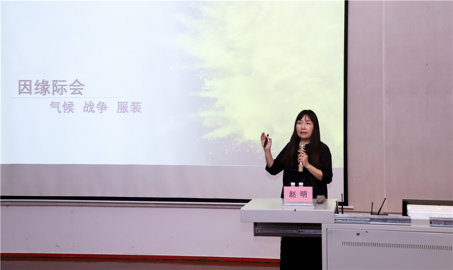 2021年4月29日晚,于我校西校区伦理楼107,北京服装学院赵明教授为我校带来了一场题为《因缘际会——气候、战争与服装》的讲座,现场座无虚席。本次讲座由副校长王斌主持。