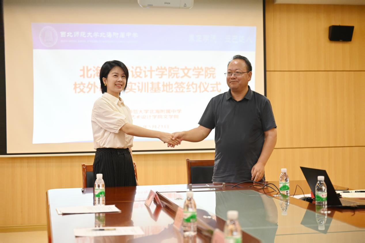 西北师范大学北海附属中学校校长孙钧在发言中指出,学校十分重视与高校的合作交流,此次与北海艺术设计学院文学院共建实训基地,能够充分发挥双方优势。一方面,为高校学生提供见习机会;另一方面,也能引入高校的先进理念和创新思维,促进中学教学质量的提升,实现双方的互利共赢。