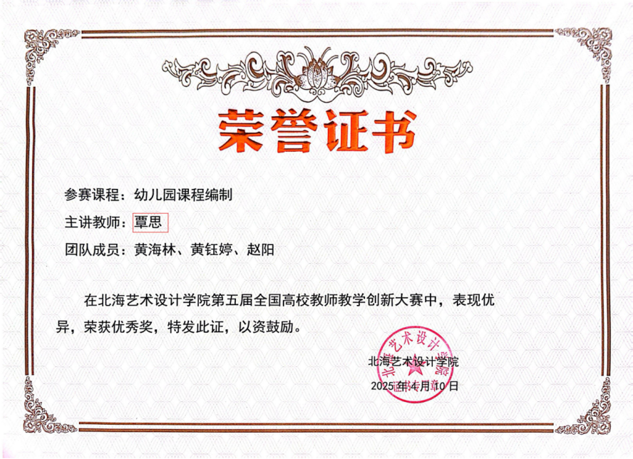 在学院“问题导向、创新驱动”的课程改革方针指导下,学前教育专业教师团队深耕课堂教学,聚焦真实问题提出解决方案,形成了一批具有辐射推广价值的创新成果。黄荣婷老师主讲的《学前儿童语言教育》课程,凭借“理论-实践-师德”三位一体的创新设计,连续斩获第三届、第五届校级教学创新大赛一等奖;冯小霞老师以“四新”理念重构《幼儿科学教育与活动指导》课程,获第四届校级教学创新大赛三等奖;覃思老师主讲的《幼儿园课程》则通过“课程思政+专创融合”模式获第五届校级教学创新大赛优秀奖。连续三届的优异成绩,不仅彰显了教师们扎实的教学功底与创新能力,更印证了学院“以赛促教、以赛促改”机制的显著成效。
