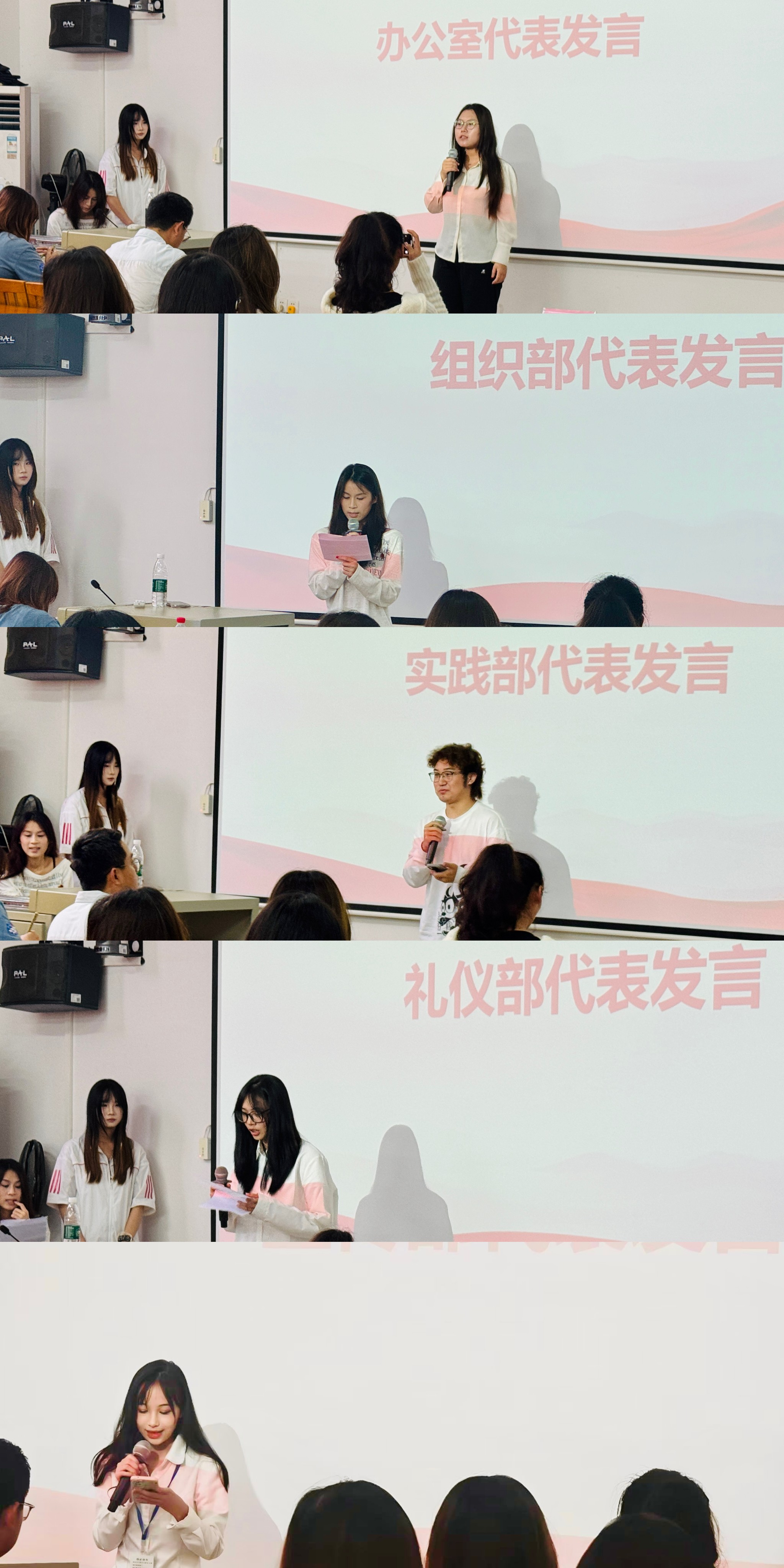 随后,学院分团委办公室、礼仪部、组织部、实践部、宣传部等部门代表依次登台,解码部门职能并公布本学期工作计划。其中,办公室聚焦 “高效统筹”,以完善制度、协调资源为重点,筑牢后勤保障;礼仪部将以专业形体训练与礼仪素养培养为抓手,在各类活动中展现服装学院良好形象;组织部深耕 “青马工程”“支部进社区” 等品牌项目,推动思想引领与组织建设双向发力;实践部主打 “创意活动 + 公益行动”,计划通过学科竞赛、志愿服务等载体,为同学们搭建实践成长平台;宣传部以 “多元传播” 为目标,依托新媒体矩阵与线下宣传渠道,讲好服装学院学生故事。