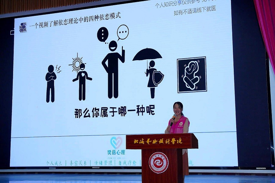 讲座开始由国家三级心理咨询师、中级沙盘游戏咨询师,广西家庭教育研究会理事、北海市家庭教育讲师团成员莫长华老师授课。她围绕“你的价值不取决于别人对你的评价”等核心观点展开暖心分享,引导同学们建立独立自信的自我认知,深刻剖析了青春情感中易出现的自我迷失问题。强调在亲密关系中保持自我本色、坚守内心边界的重要性,鼓励大家拒绝盲目迎合,以从容姿态面对情感中的起伏与挑战。