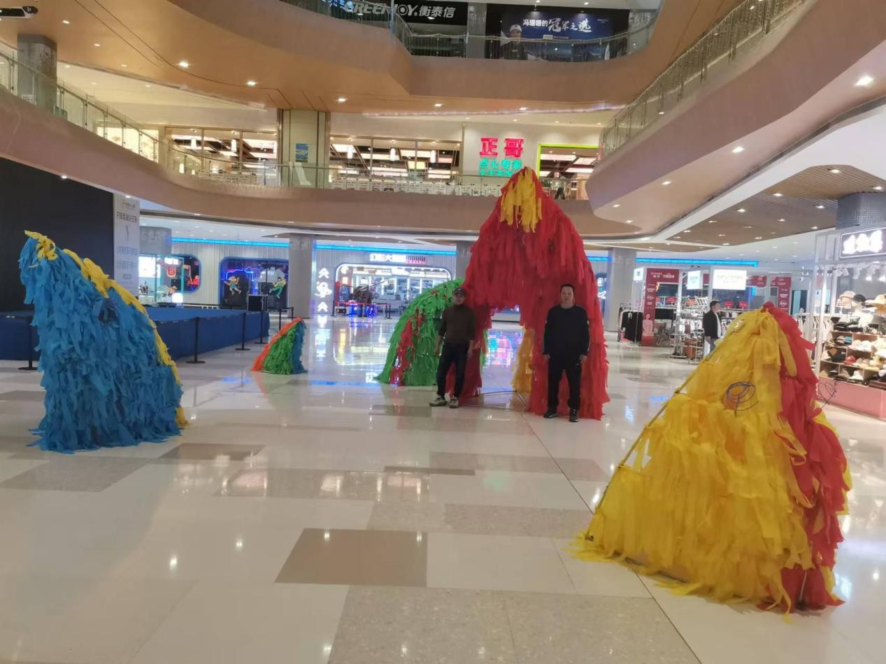 从现场的展览看出,这一活动受到了市民的广泛欢迎。与市民朋友聊天时,市民韦女士表示:以往欣赏这类艺术展要到专业展会上才能看到,没想到今天带孩子来逛街就能近距离感受艺术的魅力,非常期待这样的活动能常态化开展。市民先生也提到:今天来逛街,还能欣赏到艺术装置,并在艺术市集上淘好货,很有意思。希望公共文化进商圈活动能长期举办,让艺术走进生活。我院的作品《蛙声一片》坐落于商场的一楼大厅,游客进出商场都可以与作品形成互动。这六只不同色彩对比、抽象构成的青蛙形成了强大的空间气场,点燃了巨大商场的空间氛围,增加商场的艺术气息与格调,给人带来了无限的互动乐趣。(欧安佳 摄)