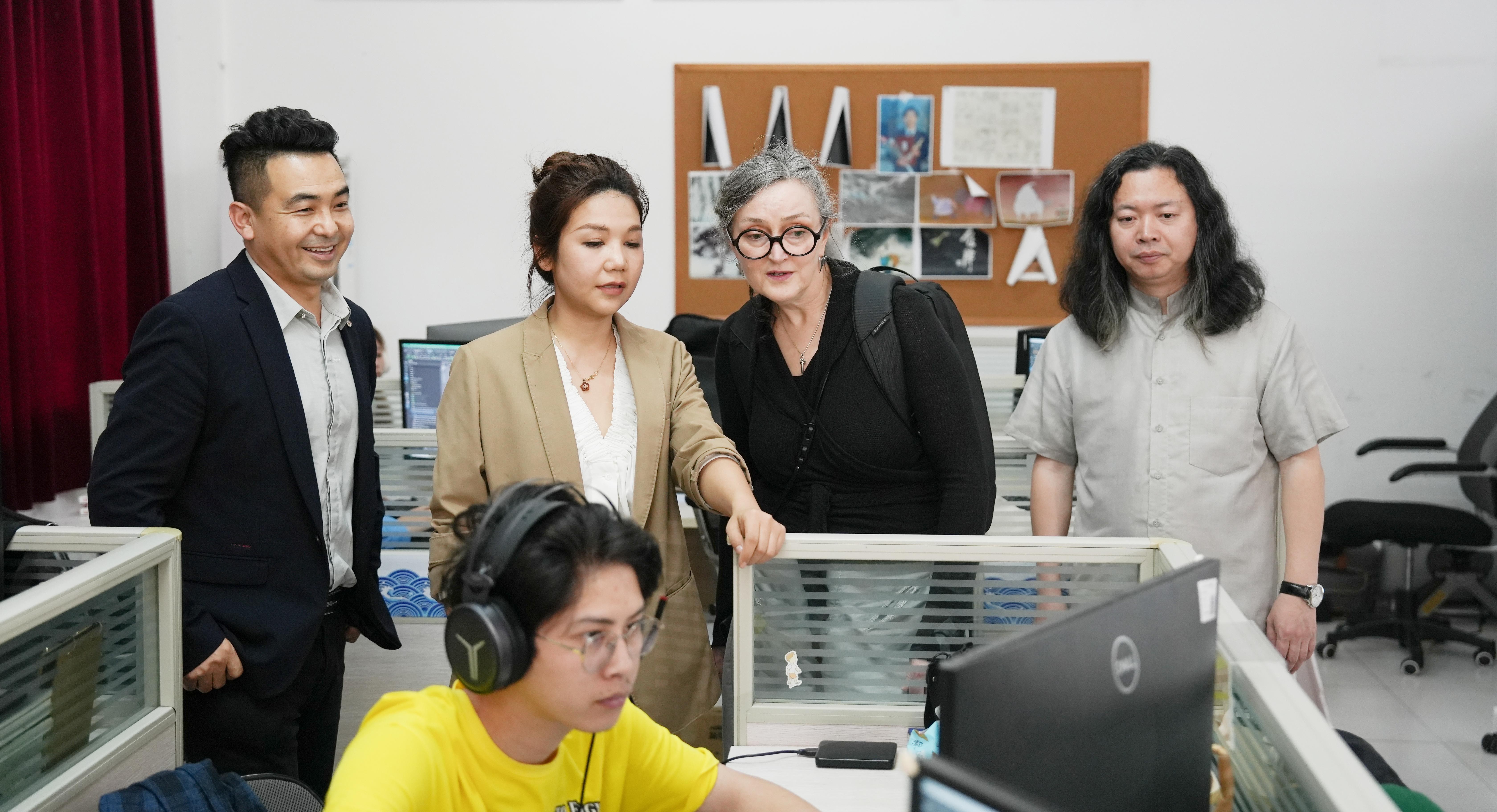 在胡胜校长、孙永辉院长、张帆书记及教学团队陪同下,穆雷院长深度参观了动画、数字媒体艺术综合实验室群,她重点考察了动捕表演室,观看了学生实时动作捕捉课程,并对虚拟实验室的摄影技术与渲染实验室的作品成果表示赞赏。孙院长向穆雷教授详细介绍了设备运行与学生项目进展。在王钢工作室,孙院长对学院正在创作中《勇敢的阿牛哥》动画项目进行讲解,穆雷院长对学生的创意实践能力给予高度评价。