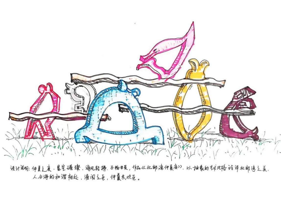 我院参加此次公共艺术周的作品名为《北部湾仲夏夜》,由雕塑教研室教师张泰莹、黄寿宁、欧安佳、杨凯、林盼鑫、金凯婧、许珍珍、覃媛媛等教师设计以及制作,共历时半个月。作品为泡沫切割成形为主,以墙漆调色上色为辅。以广西北部湾仲夏渔闲之余人们多彩的生活为背景,以不同形状及大小的海鱼为创作符号依据,对其进行提炼与简化,加以重新空间的布局与创作,作品尺寸:4mx0.8mx2m。作品表现“人”与“海”的和谐共生的主旋律。
