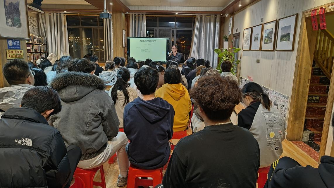 2025年11月3日晚7点,陈政军教授于三江侗族程阳八寨写生实验基地为24级美术学、绘画专业学子带来水彩与油画写生创作经验分享讲座。